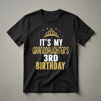 If you're a proud grandparent celebrating your granddaughter's third birthday, this regal graphic tee is the perfect way to honor her special milestone. The design features a prominent golden crown, symbolizing royalty and the importance of the occasion, surrounded by sparkling gold stars against a classic black background. Bold white text declares 'IT'S MY GRANDDAUGHTER'S' with a distressed texture, followed by '3RD' in large, clear white numbers. The word 'BIRTHDAY' is rendered in a shimmering, textured gold, mirroring the crown and stars. Turning three is a significant milestone for any toddler, marking a transition into early childhood with growing independence and personality. This t-shirt is a thoughtful gift from grandparents, aunts, uncles, or any family member wanting to honor the birthday girl. It's a wonderful way to commemorate her third birthday party, family gathering, or even just a special day out. This shirt is a fun way for grandparents to express their pride and joy in their granddaughter's milestone.