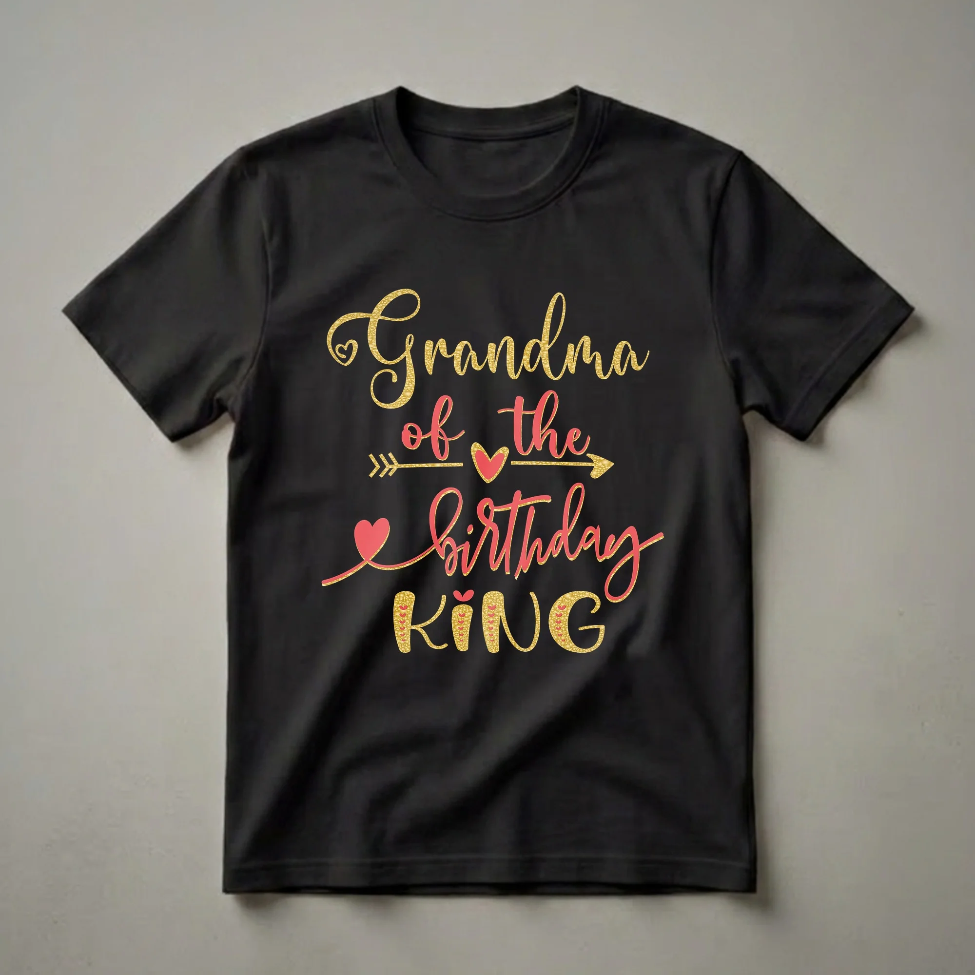 Grandmothers who want to proudly display their connection to the birthday boy will reach for this festive t-shirt. The design features the phrase "Grandma of the Birthday King" in a striking combination of gold glitter-effect lettering and vibrant red accents, including hearts and an arrow motif. This graphic tee is a wonderful way for grandmas to express their pride and joy on their grandson's special day. Birthdays are significant milestones, marking another year of growth and celebration. For a grandmother, this shirt serves as a wearable declaration of her role in the birthday boy's life. It’s a thoughtful gift idea for any occasion, whether it's for his actual birthday party, a family gathering, or just to show appreciation. Imagine her wearing this shirt to his birthday party, receiving compliments and sharing in the excitement. This t-shirt is more than just apparel; it's a symbol of the special bond between a grandmother and her grandson, the 'Birthday King'. It’s a fun and celebratory piece of clothing that adds a touch of sparkle to any birthday event.