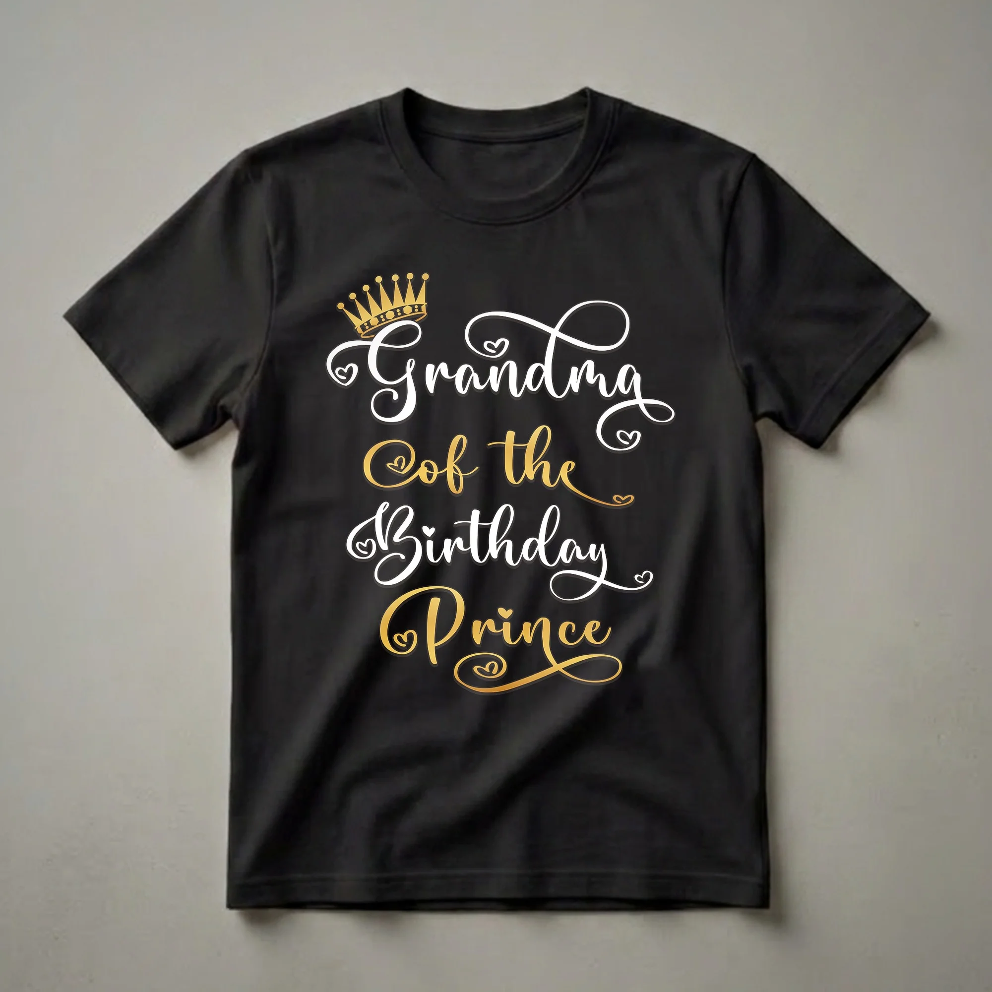 - "Grandma Of The Birthday Prince" tee with a regal golden crown and elegant script.