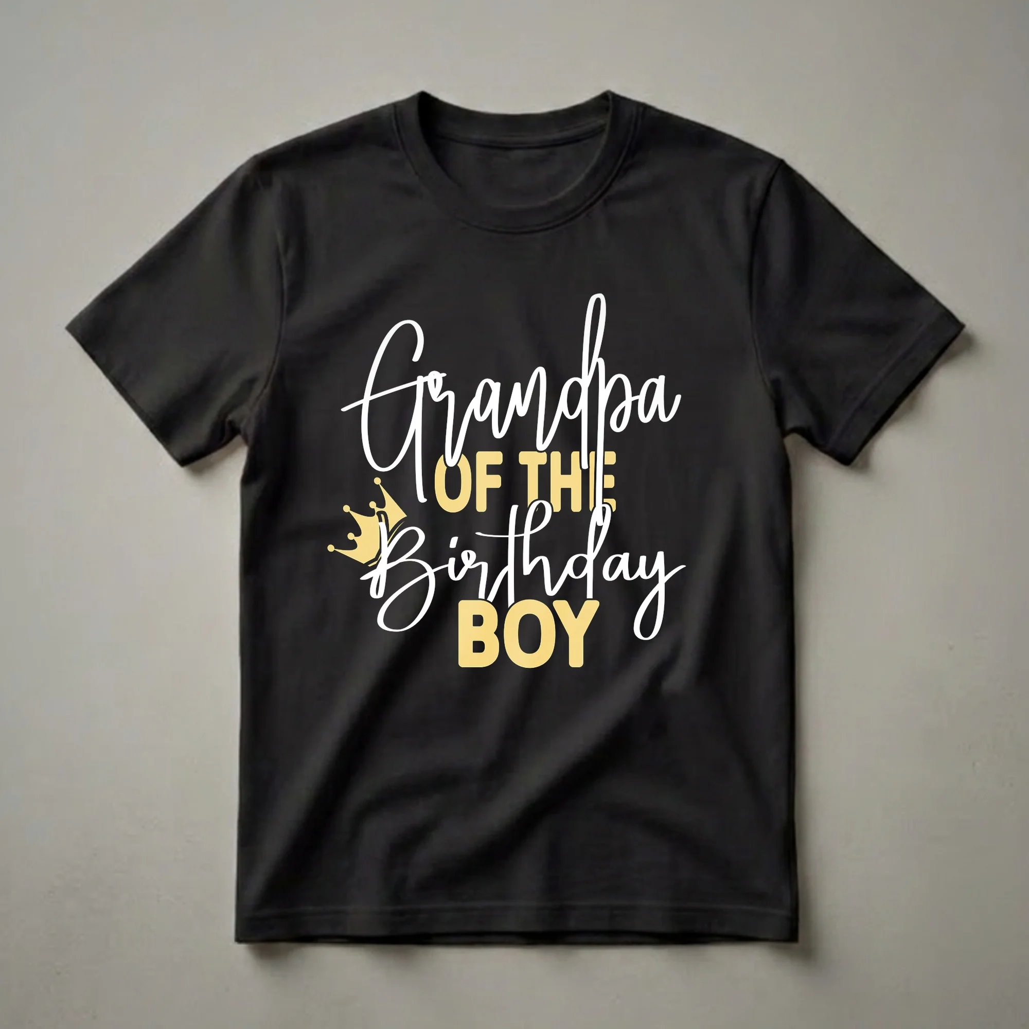 Grandpas who are proud to be the 'Grandpa Of The Birthday Boy' will reach for this eye-catching graphic tee. The design features bold, playful lettering in white and gold, with 'Grandpa' and 'Birthday Boy' in a stylish script font, and 'OF THE' in a block font. A regal gold crown adorns the left side, signifying the importance of the day. This shirt is a fantastic way for grandfathers to show their pride and join in the birthday festivities. It's a thoughtful gift for any grandpa celebrating his grandson's special day, whether it's a milestone birthday or just another year of fun. Wear this t-shirt to the birthday party, family gathering, or any event where you want to proudly announce your role. It makes a thoughtful gift and a memorable keepsake for the birthday boy's grandpa. This comfortable tee is a staple for any grandpa who loves to spoil his grandson and be part of the celebration.