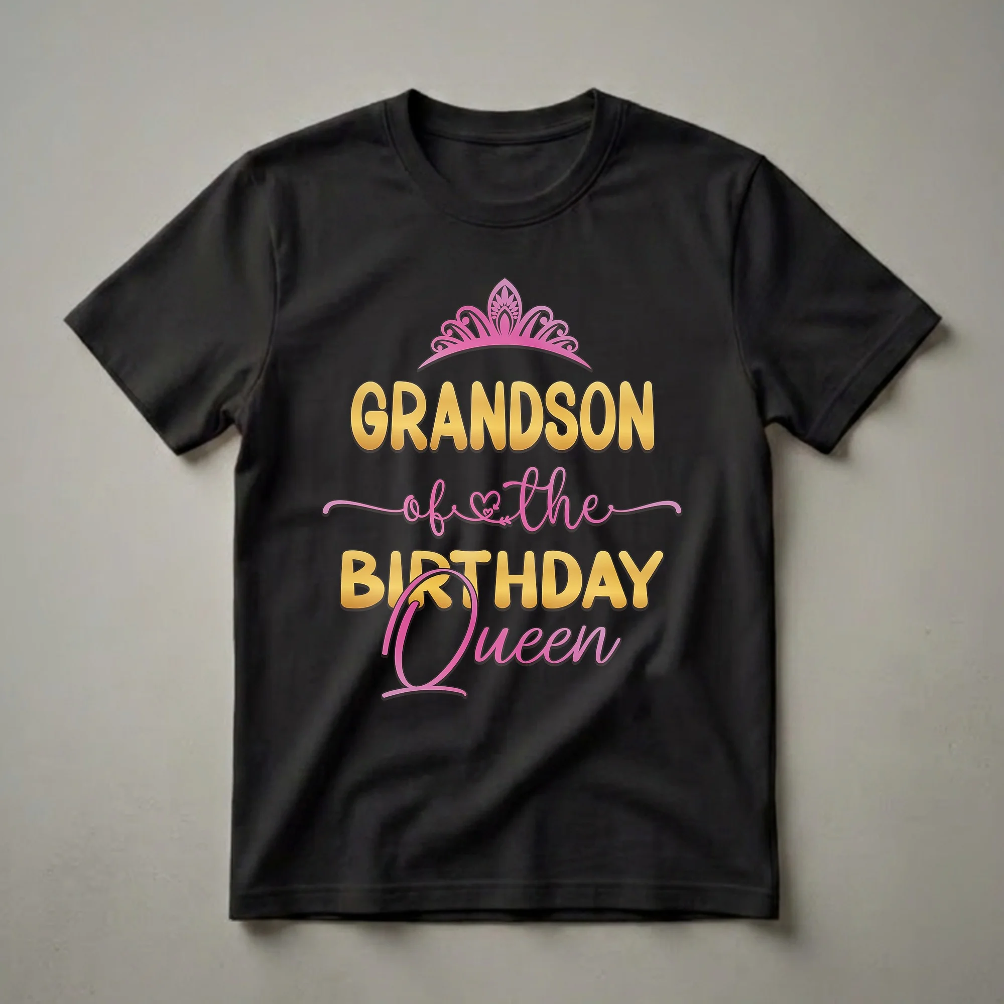 Celebrate your role as the Grandson of the Birthday Queen with this eye-catching t-shirt featuring a regal crown and elegant gold and pink lettering. The design features a prominent pink crown, symbolizing royalty, above bold gold lettering that reads "GRANDSON of the Birthday Queen." The phrase "of the" is written in a delicate pink script, with a heart and arrow detail, adding a touch of affection. Below, "BIRTHDAY Queen" is displayed in the same striking gold font, with "Queen" elegantly scripted in pink. This shirt is a thoughtful gift for any grandson who wants to show his love and pride for his grandmother, especially on her special day. It's a fun way for him to participate in the birthday festivities, whether at a family gathering, a birthday brunch, or a casual party. Wearing this t-shirt makes him an official member of the birthday queen's royal court, highlighting his role as a cherished grandson. This apparel is a great way to bring smiles and celebrate the matriarch of the family.