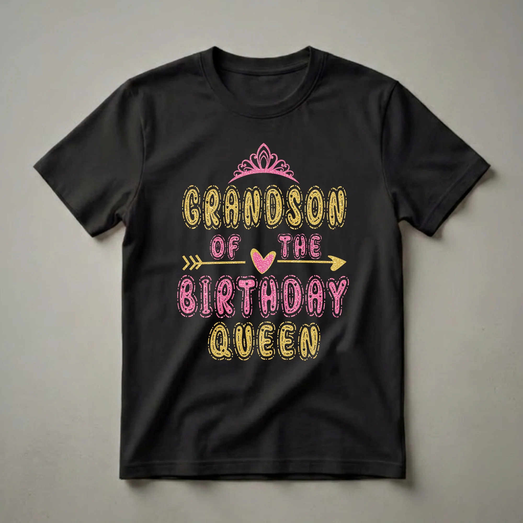 Any grandson celebrating his grannie's birthday will proudly wear this 'Grandson of the Birthday Queen' graphic t-shirt. This eye-catching graphic tee is a fantastic way for any grandson to celebrate his grannie's special day. The design features a vibrant pink crown atop bold, glittery gold lettering that spells out 'GRANDSON'. Below, a golden arrow with a pink heart accent separates the text, leading to 'OF THE BIRTHDAY QUEEN' in a dazzling pink font. This shirt is a thoughtful gift for grandsons who want to honor their grannie, especially for her birthday celebrations. It's a fun piece of apparel that can be worn to birthday parties, family gatherings, or casual outings, showcasing the special bond between a grandson and his beloved grannie. Imagine the smile on her face when she receives this unique birthday shirt, a testament to her royal status in his life. This t-shirt is more than just clothing; it's a declaration of love and admiration for the matriarch of the family. It makes a wonderful present for any occasion where you want to make the Birthday Queen feel extra special.