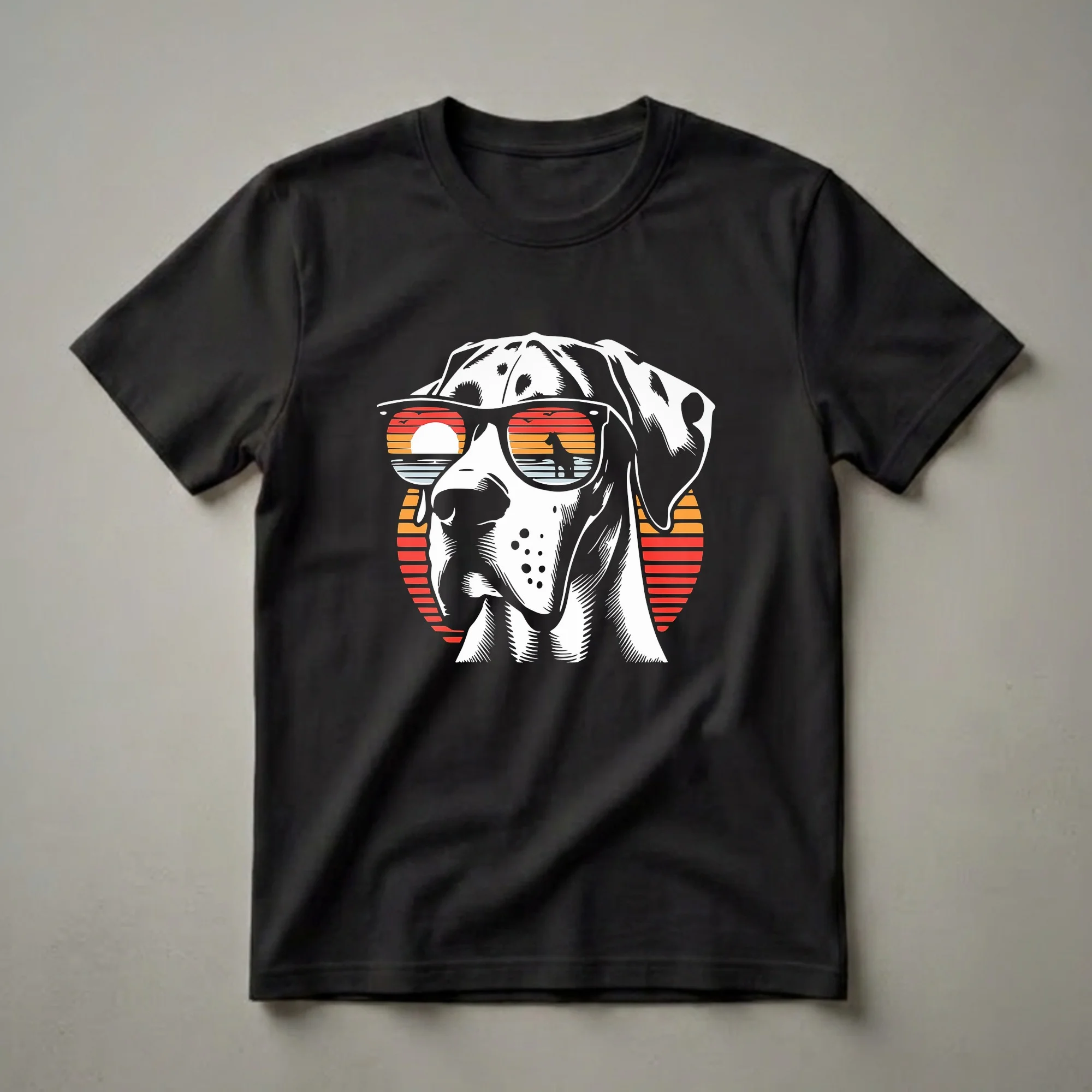 - Features a cool Great Dane wearing sunglasses with a retro sunset reflection.