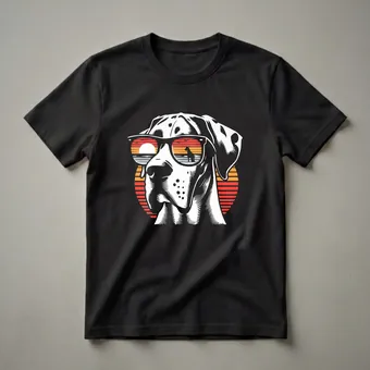 Great Dane owners who appreciate a touch of retro style will reach for this eye-catching graphic tee. The design features a striking black and white illustration of a Great Dane, its face adorned with cool sunglasses. Reflected within the lenses is a vibrant retro sunset scene, complete with a silhouette of a horse and a bird in flight, evoking a sense of freedom and adventure. Great Danes, known for their gentle giants persona and regal appearance, are one of the oldest dog breeds, originating from Germany where they were bred for hunting boar and guarding estates. This shirt captures a laid-back, cool vibe, making it a go-to piece for casual outings or relaxing at home. It makes a thoughtful gift for any Great Dane mom or dad who enjoys unique dog-themed apparel. Wear this t-shirt to your next dog park visit, a casual brunch, or simply while lounging with your beloved canine companion. This unique shirt is a fantastic way to express your admiration for this magnificent breed.