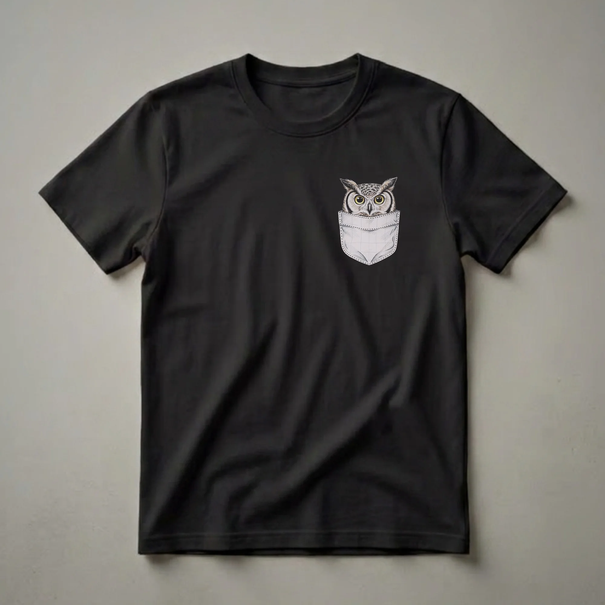 Bird watchers and nature enthusiasts will appreciate this striking graphic tee featuring a detailed sketch of a Great Horned Owl peeking from a stylized pocket. The drawing captures the owl's intense yellow eyes and intricate feather patterns with a vintage, hand-drawn aesthetic. Great Horned Owls, known for their distinctive ear tufts and powerful talons, are found across North and South America, inhabiting diverse environments from deserts to forests. They are nocturnal predators, often heard before they are seen, with a deep hooting call. This t-shirt is a fantastic way for any owl admirer to express their passion. It makes a thoughtful gift for the bird lover in your life who appreciates unique wildlife art. Wear this shirt on your next nature walk, to a birdwatching event, or simply as a conversation starter that highlights your fascination with these magnificent nocturnal birds. This comfortable tee is a staple for anyone who enjoys the wild beauty of avian life.