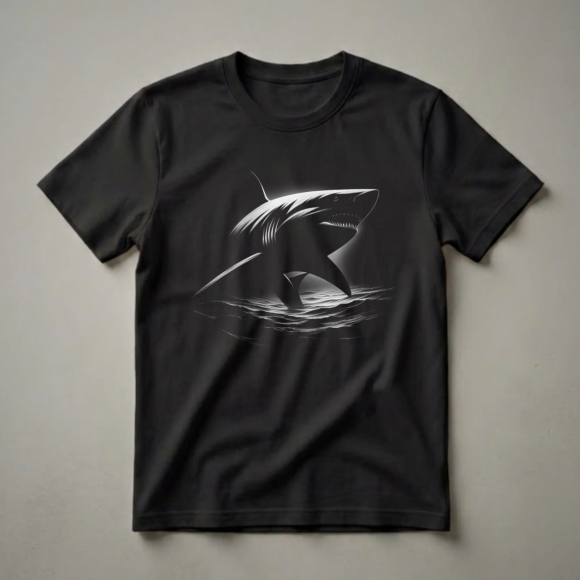 Ocean lovers and admirers of apex predators will appreciate this dramatic graphic tee. The artwork depicts a powerful great white shark, rendered in stark black and white, breaking through dark, turbulent ocean waves. Its sharp teeth are visible, conveying the raw power and majesty of this iconic marine animal. Great white sharks, scientifically known as Carcharodon carcharias, are found in coastal waters worldwide and are renowned for their size and hunting prowess. This t-shirt is a thoughtful gift for anyone fascinated by the ocean's most formidable inhabitants. It's a staple in the collection for divers, marine biologists, or simply those who feel a connection to the sea and its creatures. Wear this shirt to your next beach outing or while watching documentaries about marine life, and let your passion for the ocean be known. This shirt is suitable for adults and kids who share a deep respect for these magnificent animals.