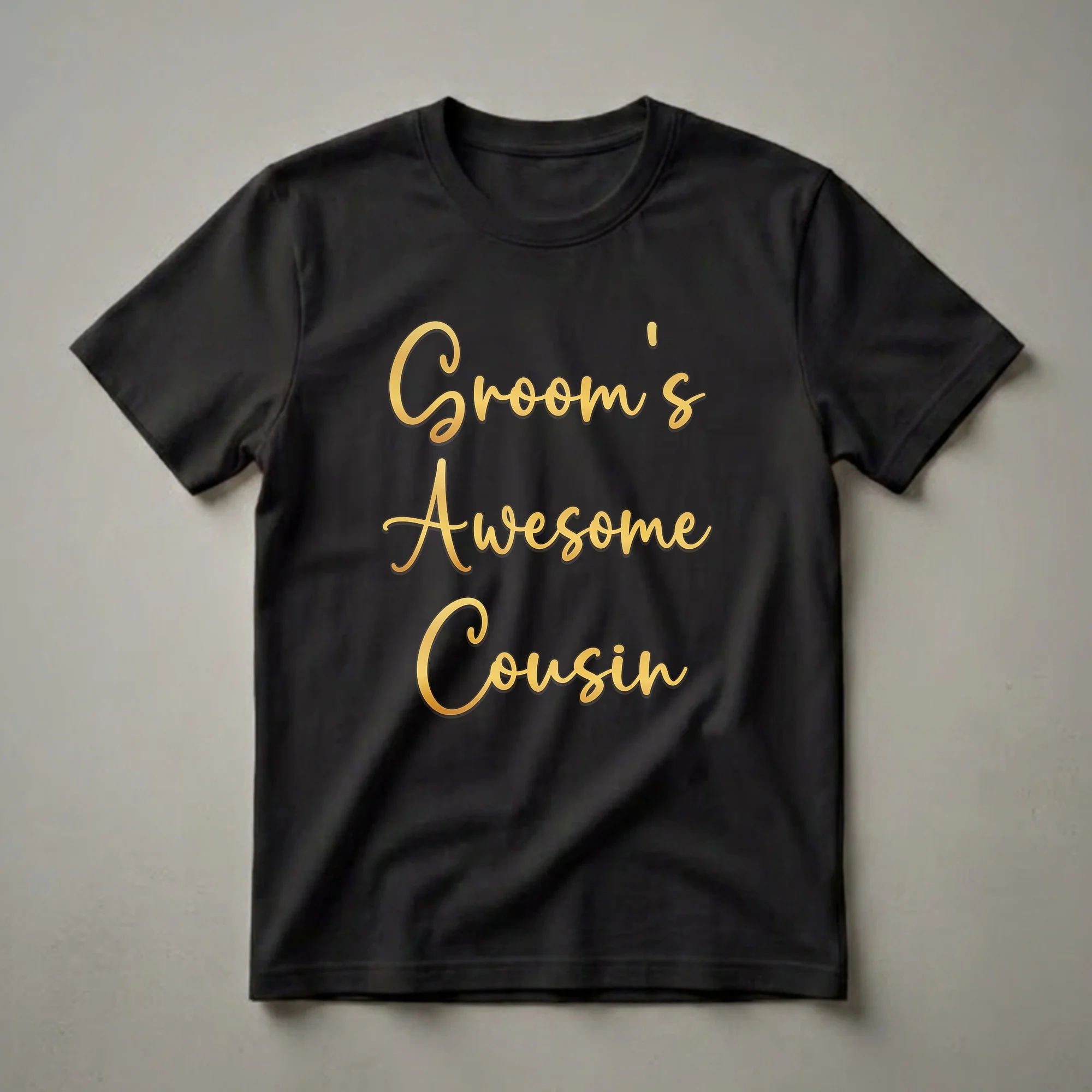 The groom's cousin will reach for this eye-catching tee to celebrate the special day. This shirt features the phrase "Groom's Cousin" in a striking gold script font against a solid black background. It's a clear and stylish declaration of their role in the wedding festivities. Weddings are significant family events, and the groom's cousin plays a unique part in the celebration, often sharing childhood memories and supporting the groom. This t-shirt is a fantastic way for them to show their pride and connection. It makes a thoughtful gift for the groom's cousin, whether they are a groomsman, part of the general wedding party, or simply a cherished family member attending the celebration. Imagine them wearing this shirt to pre-wedding events, the rehearsal dinner, or even for casual photos during the wedding weekend. It's a fun piece of apparel that acknowledges their important familial bond and their presence at such a joyous occasion. This graphic tee is a staple for any wedding party member looking to add a touch of personality to their wedding attire.