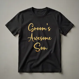The groom's son will feel celebrated in this striking graphic tee. The design features elegant gold script text that reads "Groom's Son" across the chest, set against a classic black background. This shirt is a wonderful way for the groom's son to acknowledge his important role in the wedding ceremony. It makes a thoughtful gift for the groom's son from the couple or other family members. He can wear this t-shirt to pre-wedding events, rehearsal dinners, or even on the wedding day itself, depending on the formality. This apparel is a great way to make him feel included and special during this significant family occasion. It's a keepsake he can cherish long after the wedding day has passed, reminding him of his part in the celebration.