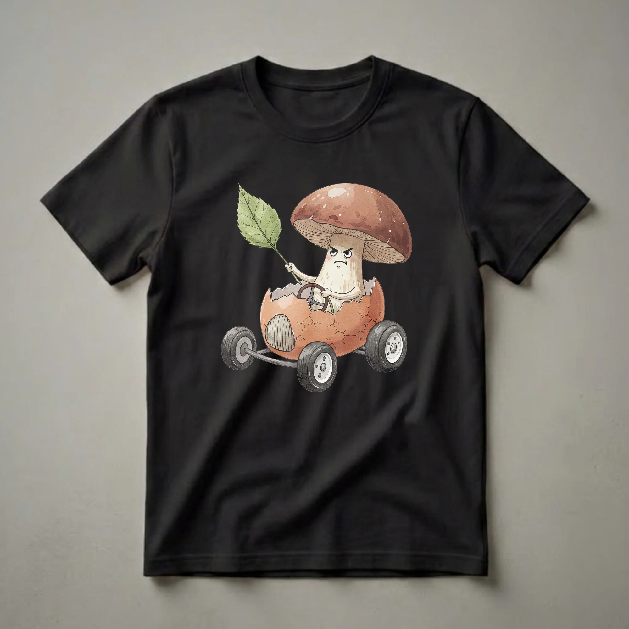 Mushroom lovers and fans of quirky humor will appreciate this eye-catching graphic tee. The design showcases a whimsical watercolor illustration of a grumpy mushroom character, complete with a large brown cap and a stern expression, piloting a cracked eggshell that has been transformed into a whimsical car. This unique vehicle is equipped with four small wheels and a steering wheel, and the mushroom driver clutches a vibrant green leaf, perhaps as a makeshift flag or steering aid. The cracked eggshell adds a layer of unexpected texture and detail to the scene, suggesting a humorous and slightly chaotic journey. This shirt is a thoughtful gift for anyone who enjoys food puns, unique art, or simply a good laugh. It's a conversation starter, well suited for casual outings, game nights, or just lounging around. The playful nature of the design makes it a go-to tee for those who don't take themselves too seriously and enjoy a touch of the absurd in their wardrobe. Imagine wearing this to a brunch with friends or a casual get-together; it's sure to bring smiles. The watercolor style lends a soft, artistic feel to the bold, humorous concept, making it a standout piece.