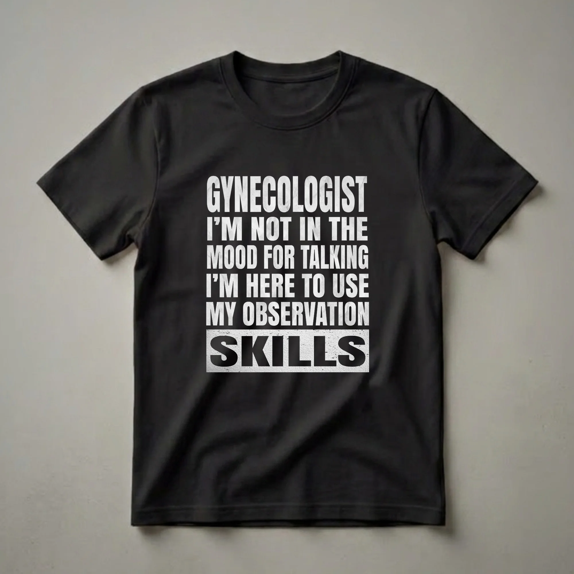 Gynecologists who appreciate a bit of dry humor will reach for this unique graphic tee. The design features bold, distressed white lettering on a black background, proclaiming 'GYNECOLOGIST I'M NOT IN THE MOOD FOR TALKING I'M HERE TO USE MY OBSERVATION SKILLS'. This shirt speaks to the focused, diagnostic nature of medical professionals, particularly those in obstetrics and gynecology. The field of gynecology, a specialized branch of medicine focused on women's reproductive health, requires keen observation and diagnostic skills. This tee humorously highlights that aspect, suggesting a preference for action and assessment over idle chatter. It's a thoughtful gift for any gynecologist, OB/GYN, or medical student entering the field who has a sense of humor about their demanding profession. This shirt works well for casual Fridays at the clinic or for wearing during downtime. It's a conversation starter that acknowledges the serious work involved in women's healthcare with a lighthearted touch. The distressed font adds a vintage, rugged feel to the statement, making it stand out.