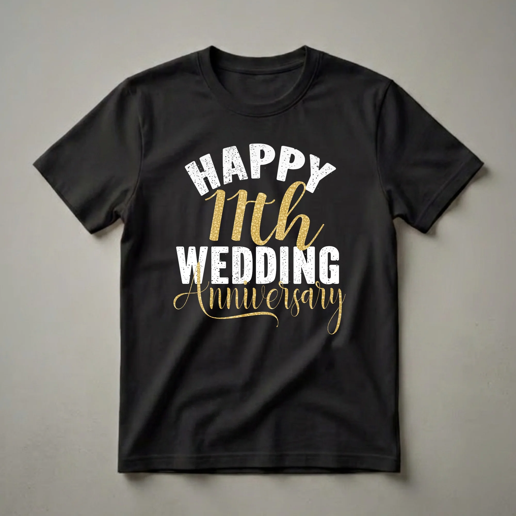Couples celebrating their eleventh wedding anniversary can mark the occasion with this special matching t-shirt. The design features bold, distressed white lettering for 'HAPPY' and 'WEDDING', creating a vintage feel. Below, '11th' and 'Anniversary' are rendered in a luxurious, textured gold glitter effect, adding a touch of sparkle to the celebration. This tee is a wonderful way for husbands and wives to show their unity and commemorate over a decade of marriage. The eleventh anniversary is traditionally associated with steel, symbolizing strength and durability, much like a long-lasting marriage. This shirt makes a thoughtful gift for any couple reaching this significant milestone, whether for a party, a special dinner, or just to wear as a matching set throughout the year. It's a wearable reminder of their enduring love and commitment.