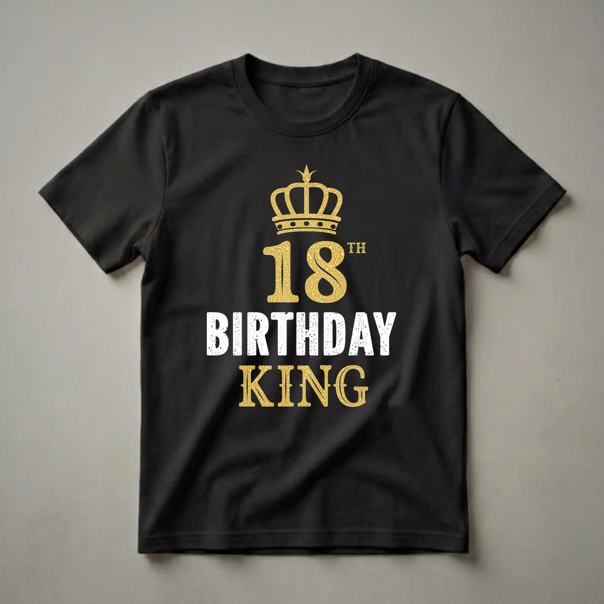 Any eighteen-year-old king celebrating his transition into adulthood will love making a statement in this bold 'Birthday King' graphic tee.This 'Birthday King' t-shirt is designed to celebrate this momentous occasion for any young man reaching this age. The striking graphic features a regal golden crown positioned above a large, textured number '18', signifying the eighteen years of life. Below this, the words 'BIRTHDAY KING' are emblazoned in bold, distressed white lettering, creating a powerful statement. The entire design pops against a black background, common for many graphic tees. This shirt is a fantastic way for an 18-year-old to feel celebrated and special on his birthday. It's a thoughtful gift idea for parents, family members, or friends looking to commemorate this important birthday. Imagine him wearing this eye-catching tee to his birthday party, dinner, or any celebration marking his entry into adulthood. This graphic tee serves as a wearable declaration of his new status as he embarks on this exciting new chapter.