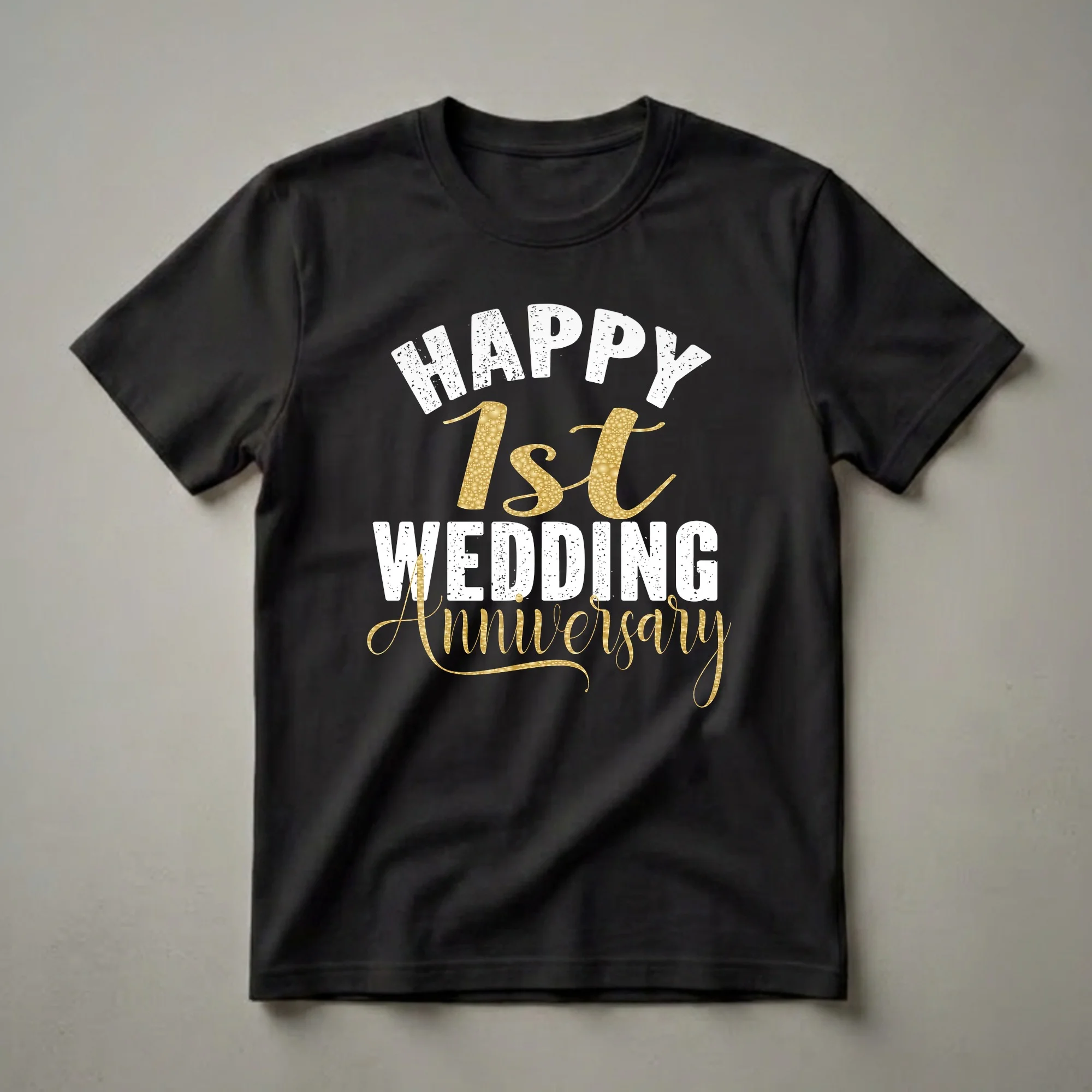 Couples celebrating their first wedding anniversary can mark this significant milestone with a special matching t-shirt. The design features bold, distressed white lettering for 'HAPPY' and 'WEDDING', creating a classic look. The number '1st' and the word 'Anniversary' are rendered in an eye-catching textured gold effect, adding a touch of elegance and celebration to the graphic. This tee is a wonderful way for newlyweds to showcase their journey together as they complete their initial year of marriage. The first anniversary is traditionally associated with paper, symbolizing the newness and fragility of the union, making a personalized or commemorative item like this shirt a fitting tribute. This shirt works well for couples who want to wear matching attire for anniversary photos, a special dinner, or a casual celebration. It makes a thoughtful gift for any couple reaching this romantic milestone, offering a fun and memorable way to commemorate their commitment. Whether for him or her, this t-shirt serves as a sweet reminder of their wedding day and the year that has passed.