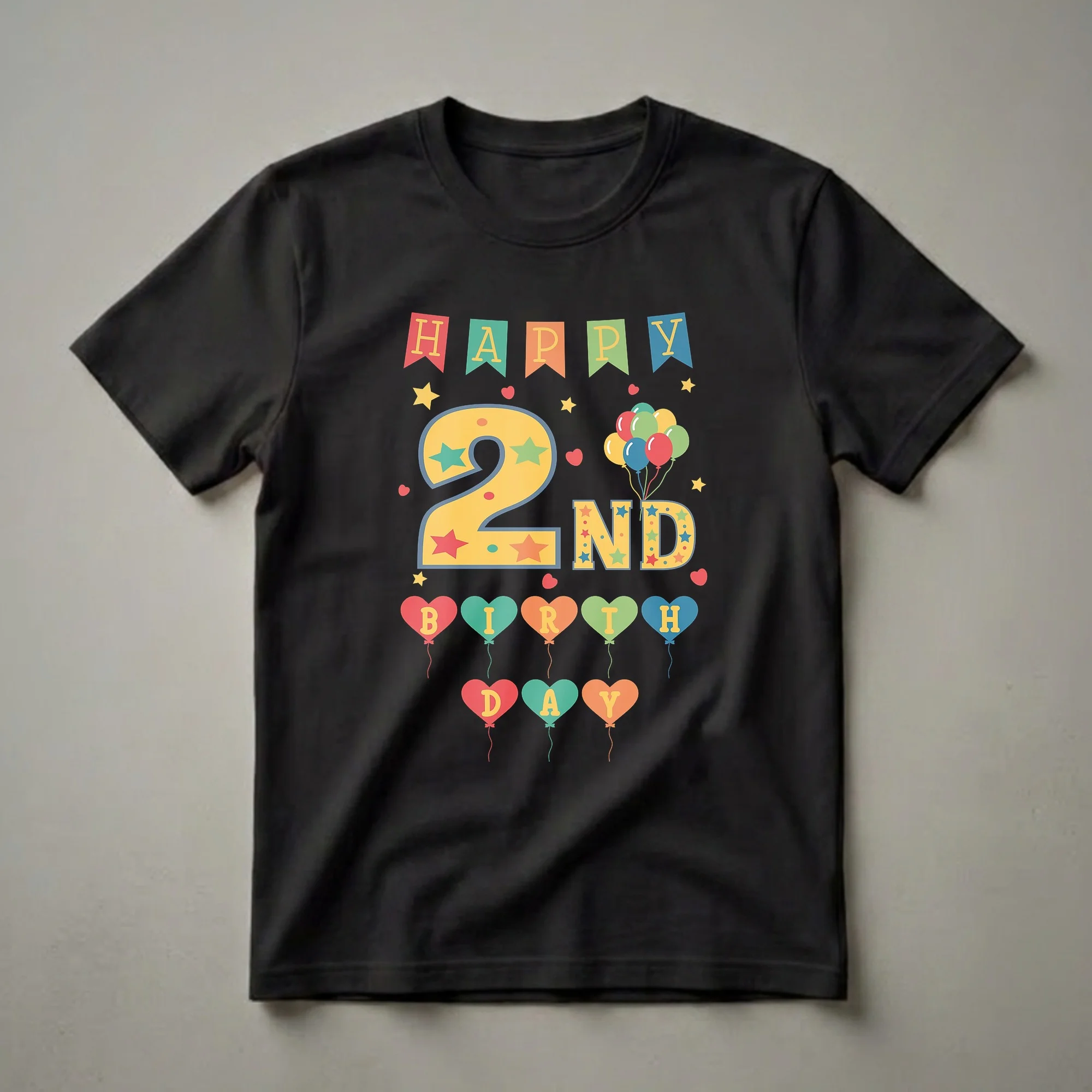 Celebrate a special two-year-old's birthday with this vibrant graphic tee featuring balloons, banners, and a cheerful "2nd Birthday" message. This festive birthday shirt captures that joy with a vibrant design a natural fit for any child turning two. The graphic showcases a cheerful "Happy 2nd Birthday" message, adorned with colorful banners, a cluster of festive balloons, and playful stars and hearts. The prominent "2nd" is rendered in a large, eye-catching yellow, decorated with smaller stars and polka dots, making it instantly recognizable for the birthday boy or girl. Below, heart-shaped balloons spell out "BIRTHDAY" and "DAY" in a rainbow of colors, adding to the celebratory atmosphere. This t-shirt is a wonderful way for a two-year-old to feel special on their big day. It makes a thoughtful gift for any toddler celebrating their second birthday, whether it's for a party, a family gathering, or just a fun way to mark the milestone. This shirt is well suited for a two-year-old boy or girl who loves bright colors and fun designs. They will reach for this tee to wear to their birthday party or any special occasion.