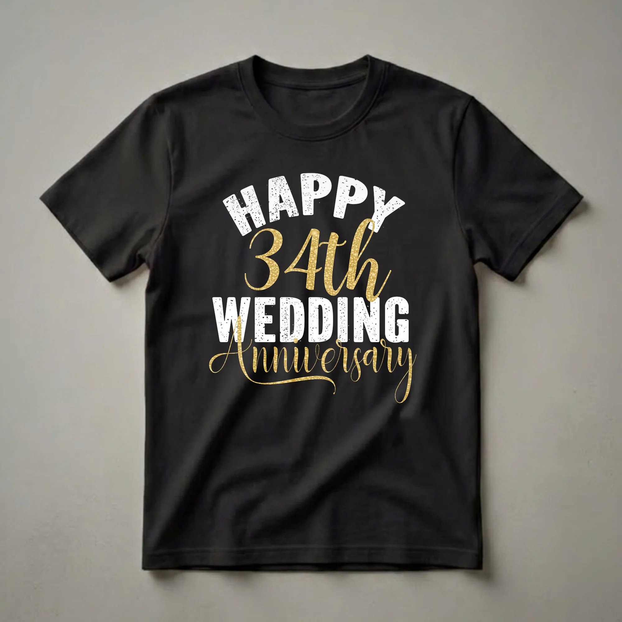 Couples celebrating their 34th wedding anniversary can mark the occasion with this celebratory graphic tee. The design features bold, distressed white lettering for 'HAPPY' and 'WEDDING', while '34th' and 'Anniversary' are rendered in an elegant, shimmering gold with a textured, bubbly effect. This shirt is a wonderful way for a husband and wife to showcase their enduring love and commitment as they reach this significant milestone. Thirty-four years of marriage is traditionally associated with the amethyst gemstone, symbolizing peace and clarity, a fitting representation of a long-lasting union. This t-shirt makes a thoughtful gift for your spouse or for another couple you know who is celebrating their 34th year together. Wear it to an anniversary dinner, a party, or a casual get-together to share your joy.