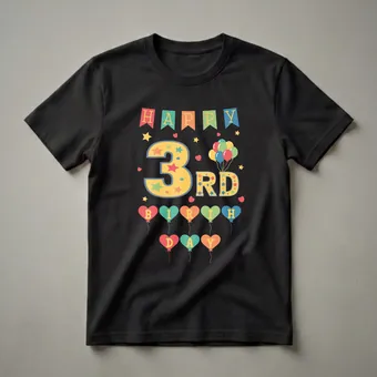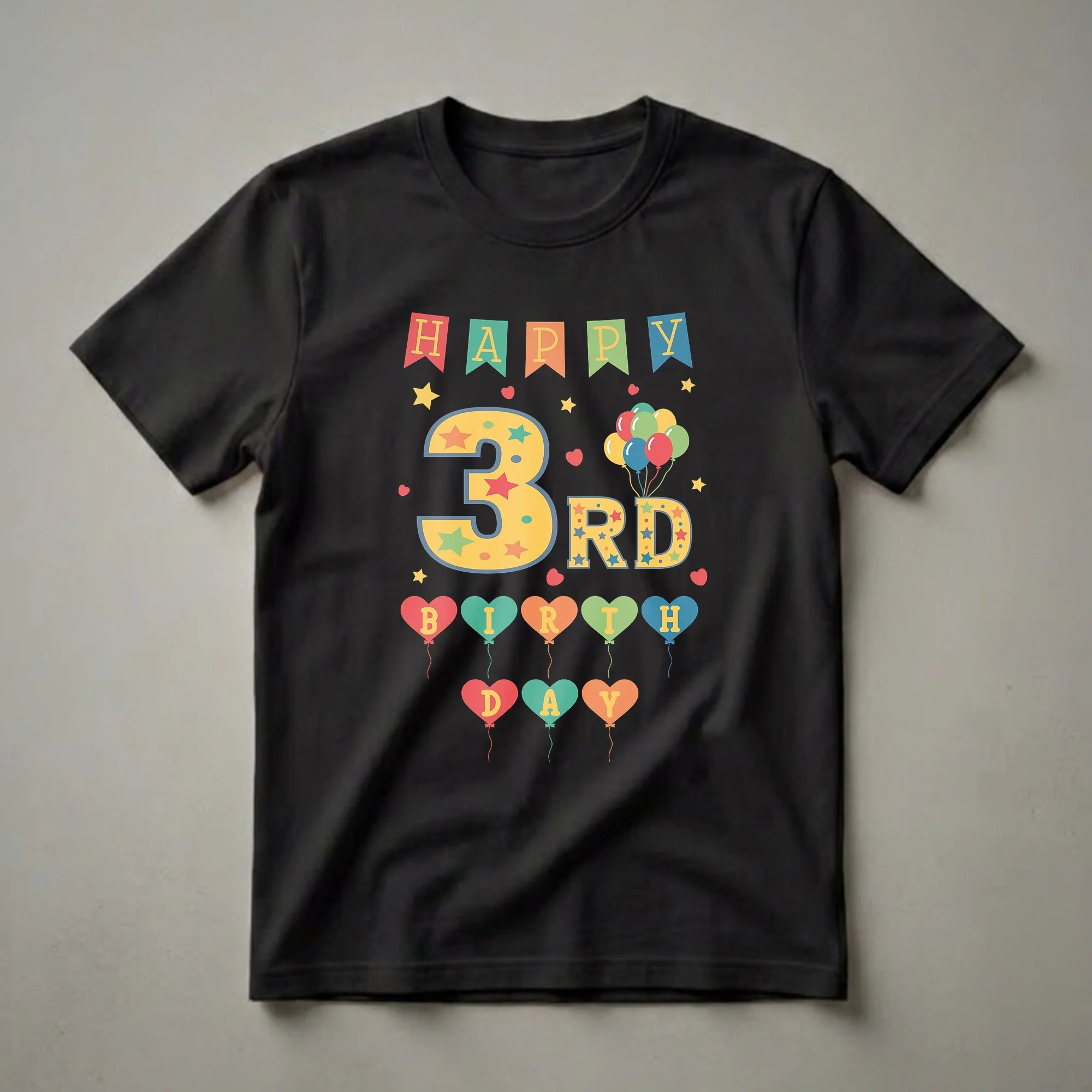 Celebrate your little one's big day with a vibrant t-shirt showcasing colorful banners, balloons, and a prominent '3rd' for their third birthday party. This festive t-shirt captures the joy of turning three with a cheerful design. The graphic features colorful banners spelling out 'HAPPY', a large, bright yellow '3rd' adorned with stars and polka dots, and a cluster of balloons in red, blue, green, and yellow. Below, heart-shaped balloons spell out 'BIRTHDAY'. This eye-catching shirt is made for young children celebrating their special day. It's a thoughtful gift for any 3-year-old boy or girl, great to wear to a birthday party, a family gathering, or just for everyday fun. Imagine the birthday child's delight as they wear this shirt, surrounded by friends and family, marking their third year with vibrant style. This tee is a wonderful way to commemorate this exciting age, ensuring the birthday boy or girl feels celebrated and special on their big day. It’s a staple for any toddler’s birthday wardrobe.