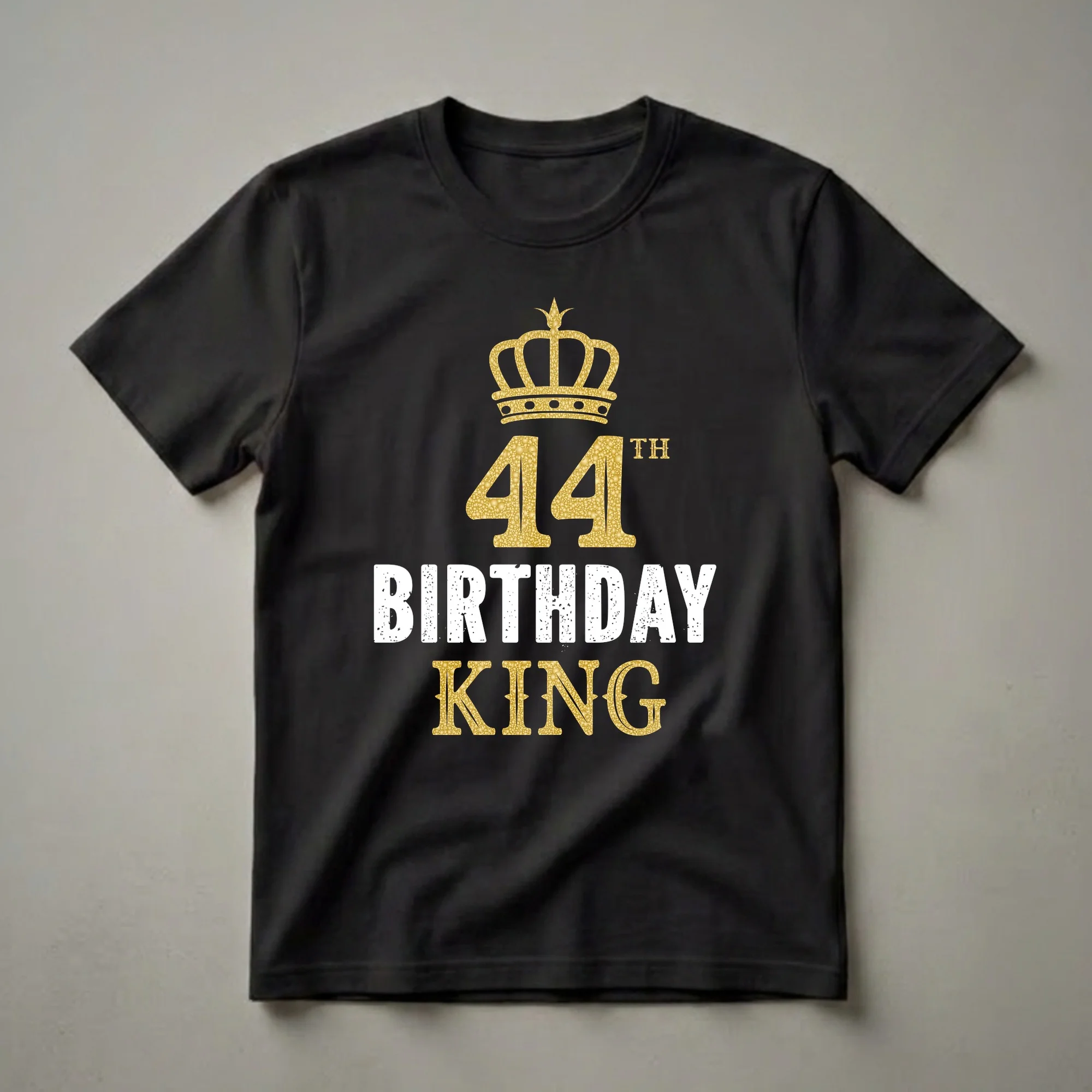 - Mark your 44th birthday with this 'King' graphic tee featuring a golden crown.