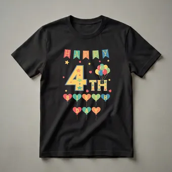 Turning four is a significant milestone, marking a child's transition into a more independent and curious stage of early childhood. This festive t-shirt captures the joy of that special day with a vibrant design. The graphic showcases a colorful banner spelling out "HAPPY" across the top, followed by a large, playful "4TH" adorned with stars and polka dots. A cluster of bright balloons in red, blue, green, and yellow floats above the text, adding to the celebratory atmosphere. Below, heart-shaped balloons spell out "BIRTHDAY," each in a different cheerful hue. This eye-catching shirt is a wonderful way for any child to express their excitement on their fourth birthday. It makes a thoughtful gift for a 4-year-old boy or girl, great to wear to a birthday party, family gathering, or just for everyday fun. Parents and grandparents will love seeing their little one sport this cheerful apparel as they celebrate this important age. This tee is a fantastic way to commemorate a child's fourth year.