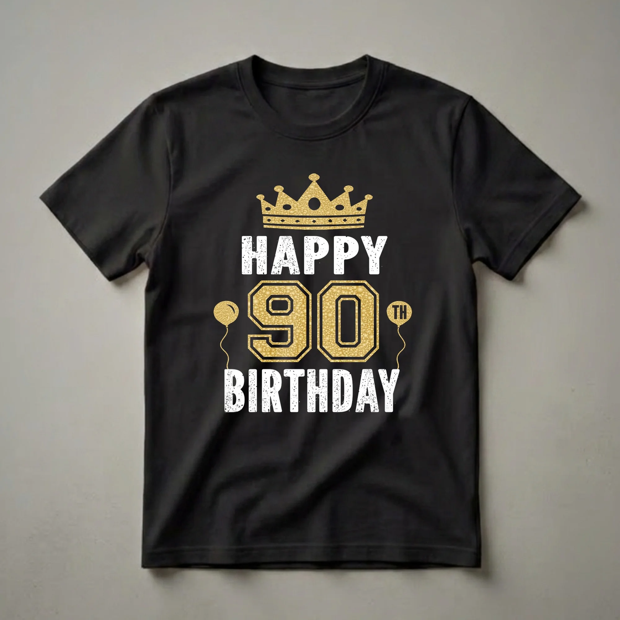 - Celebrate nine decades with this distressed "HAPPY BIRTHDAY" text and regal gold "90" crown graphic tee.