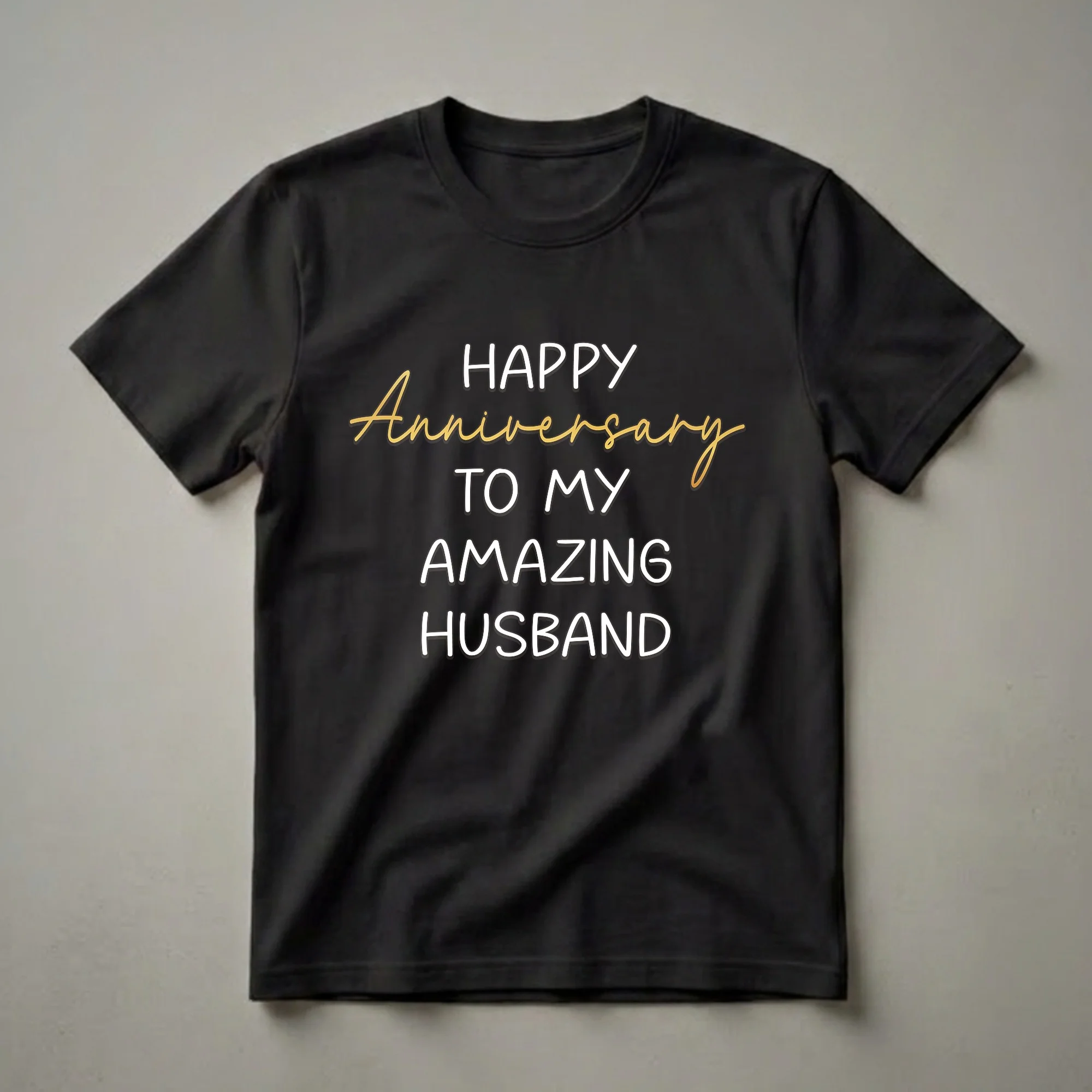 Wives looking to express their love for their husbands will reach for this special anniversary tee. The design features bold white lettering for 'HAPPY' and 'TO MY HUSBAND', with 'Anniversary' written in an elegant, flowing gold script. This shirt is a wonderful way to show appreciation for the man who makes your life special. It's a thoughtful gift idea for any wife celebrating an anniversary, whether it's the first year or the fiftieth. Wear this t-shirt to your anniversary dinner, a casual celebration, or simply around the house to share your joy. This graphic tee is a staple for any wife wanting to make her husband feel cherished on their special day. It's a simple yet powerful statement of love and commitment, making it a go-to choice for expressing affection.