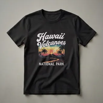 Hawaii Volcanoes National Park beckons adventurers with its raw, powerful beauty, and this graphic tee captures that spirit. The design showcases a dramatic volcanic eruption, complete with fiery lava spewing from the summit and flowing across the landscape. Silhouetted palm trees frame the scene, evoking the tropical setting of the Big Island. The vibrant, retro-inspired color palette of oranges, yellows, and blues against a dark background creates a striking visual. Below the eruption, the words "NATIONAL PARK" are emblazoned in bold, distressed lettering. This shirt is a go-to tee for anyone who has explored the unique geological wonders of Hawaii, from the Kīlauea caldera to the Chain of Craters Road. It makes a thoughtful gift for hikers, campers, and nature lovers who appreciate the dynamic forces shaping our planet. Wear this tee to remember your visit or to inspire your next adventure to this incredible national park. The park is home to two of the world's most active volcanoes, Kīlauea and Mauna Loa, offering unparalleled opportunities to witness volcanic activity firsthand. This apparel is a fantastic way to commemorate a trip or to express your passion for the natural world.