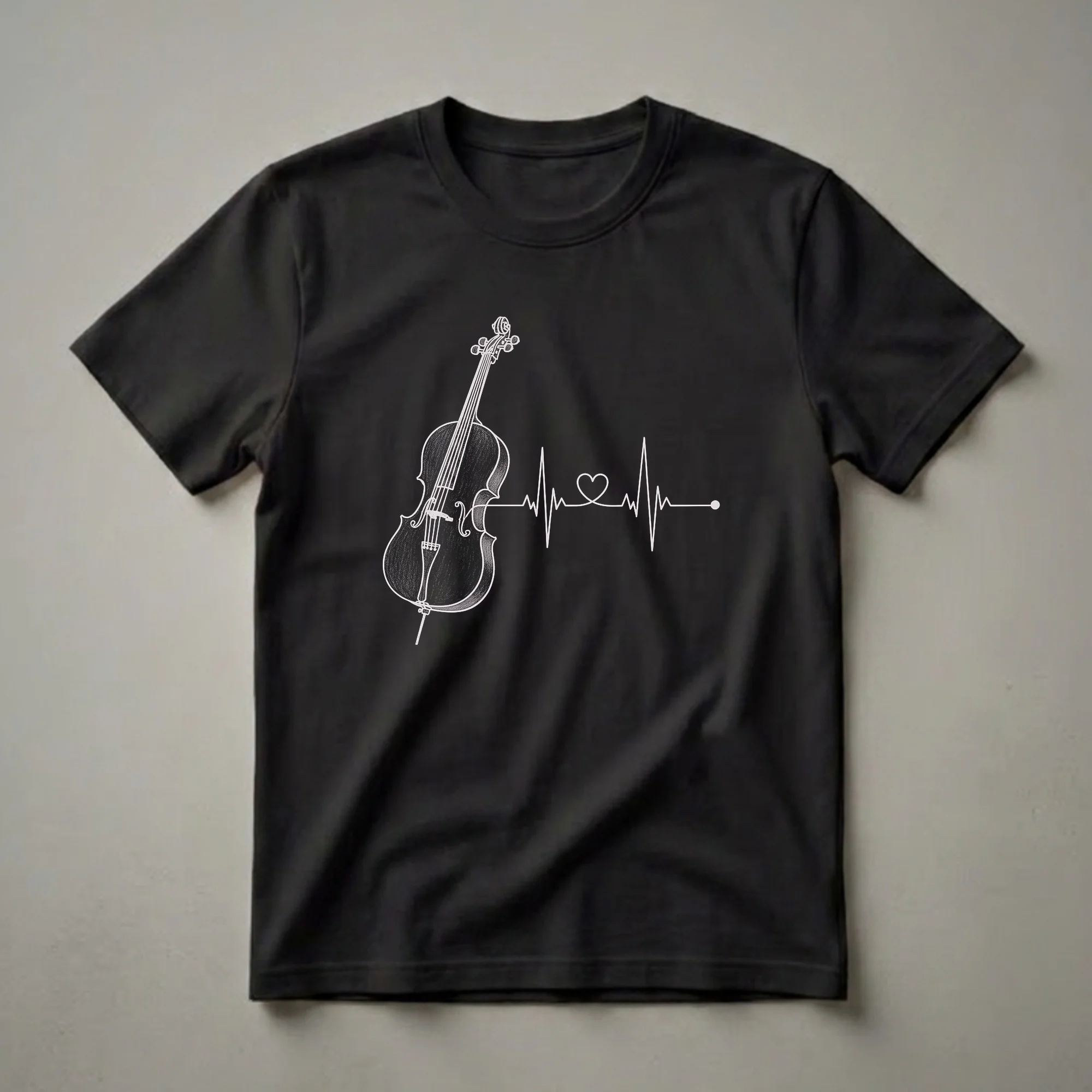 - This graphic tee elegantly blends the form of a cello with the rhythm of a heartbeat.