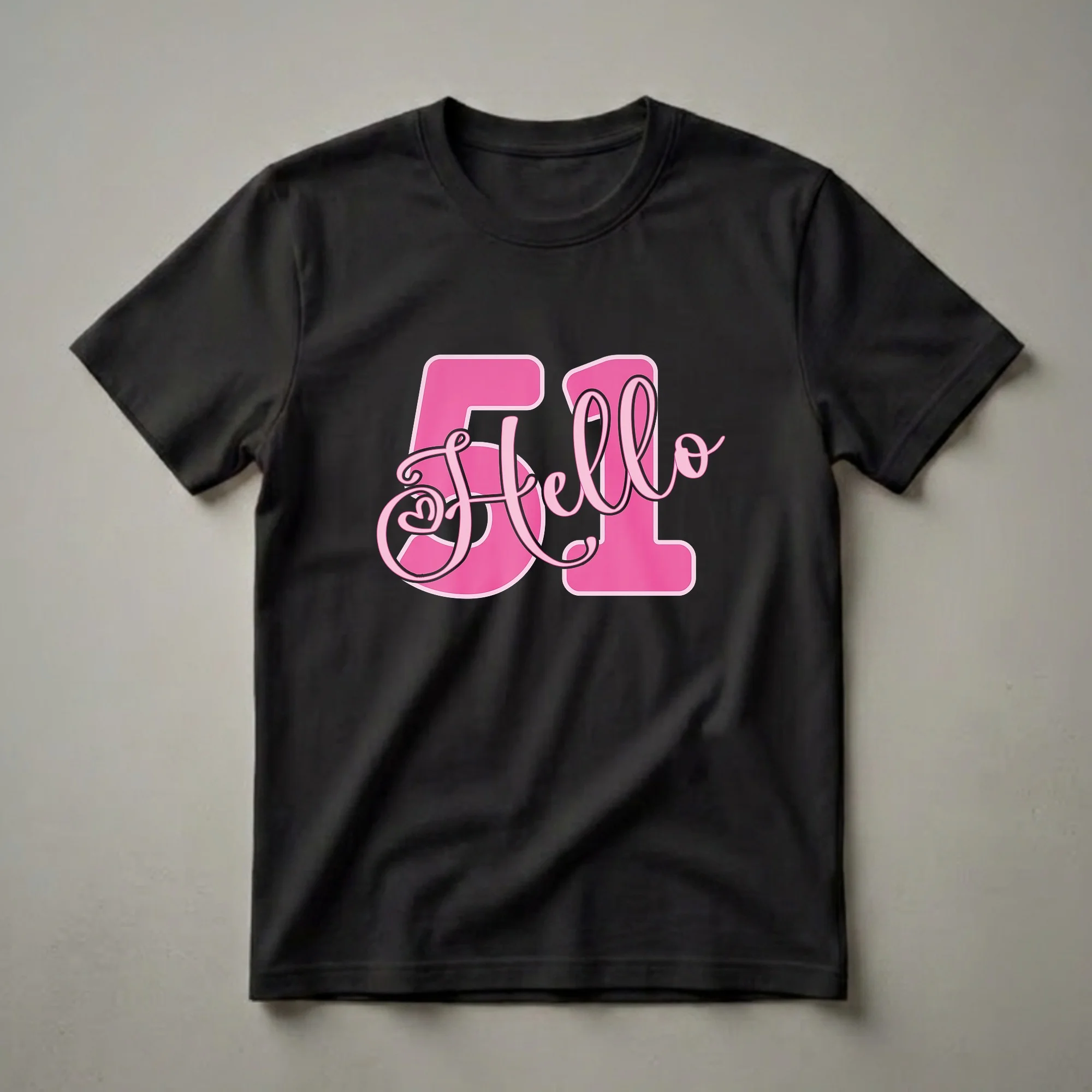 - Gift this 'Hello 51' tee to a woman celebrating her 51st birthday, featuring a bold '51' and scripted 'Hello'.