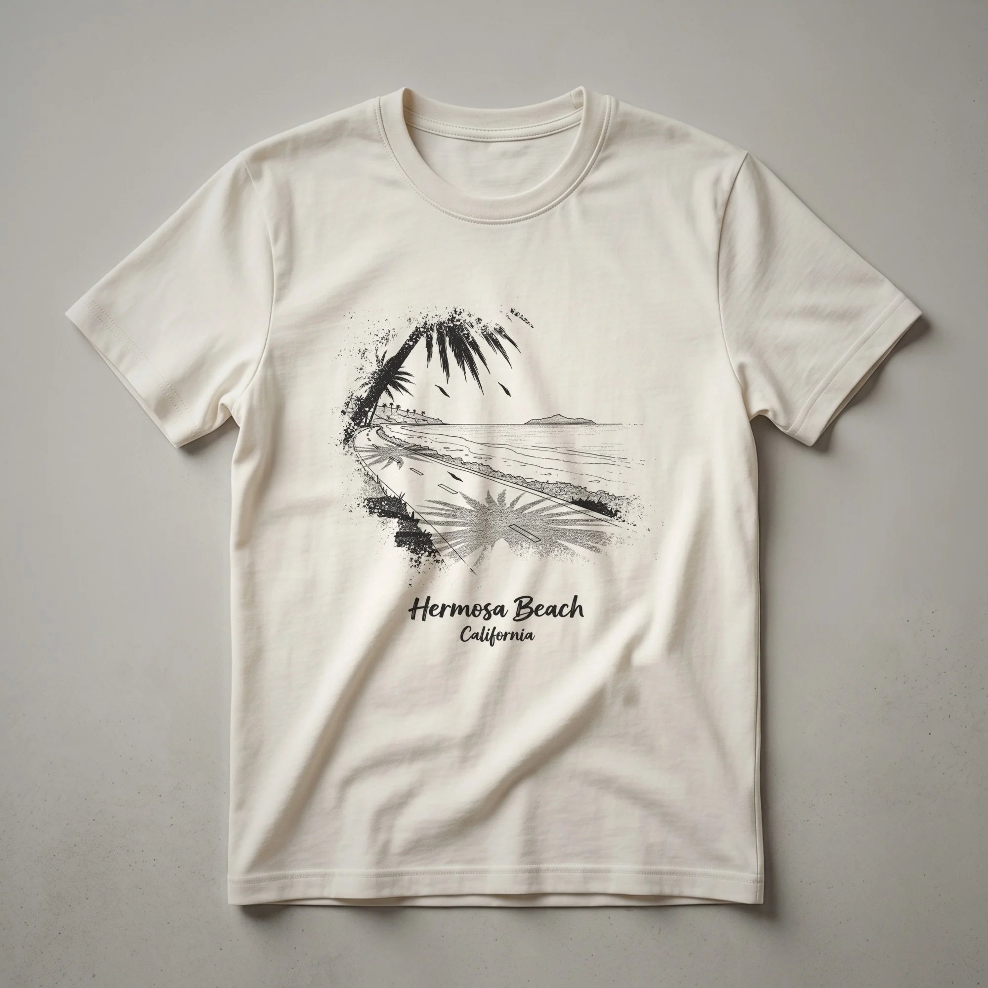 California residents and beach enthusiasts will reach for this graphic tee featuring a sketch of the iconic Hermosa Beach coastline. The design captures a scenic view of the Pacific Ocean, with palm trees lining a coastal road that curves along the shore. Distant hills frame the horizon, evoking the relaxed vibe of Southern California. This t-shirt is a staple in the collection for anyone who cherishes memories of sunny days and ocean breezes. It makes a thoughtful gift for friends and family who have a special connection to the Los Angeles area or dream of visiting its famous beaches. Wear this shirt to casual outings, beach days, or while reminiscing about your favorite California getaways. The sketch style offers a unique artistic representation of this beloved beach town, making it a conversation starter for fellow travelers and locals alike. Embrace the spirit of the coast with this eye-catching graphic shirt.