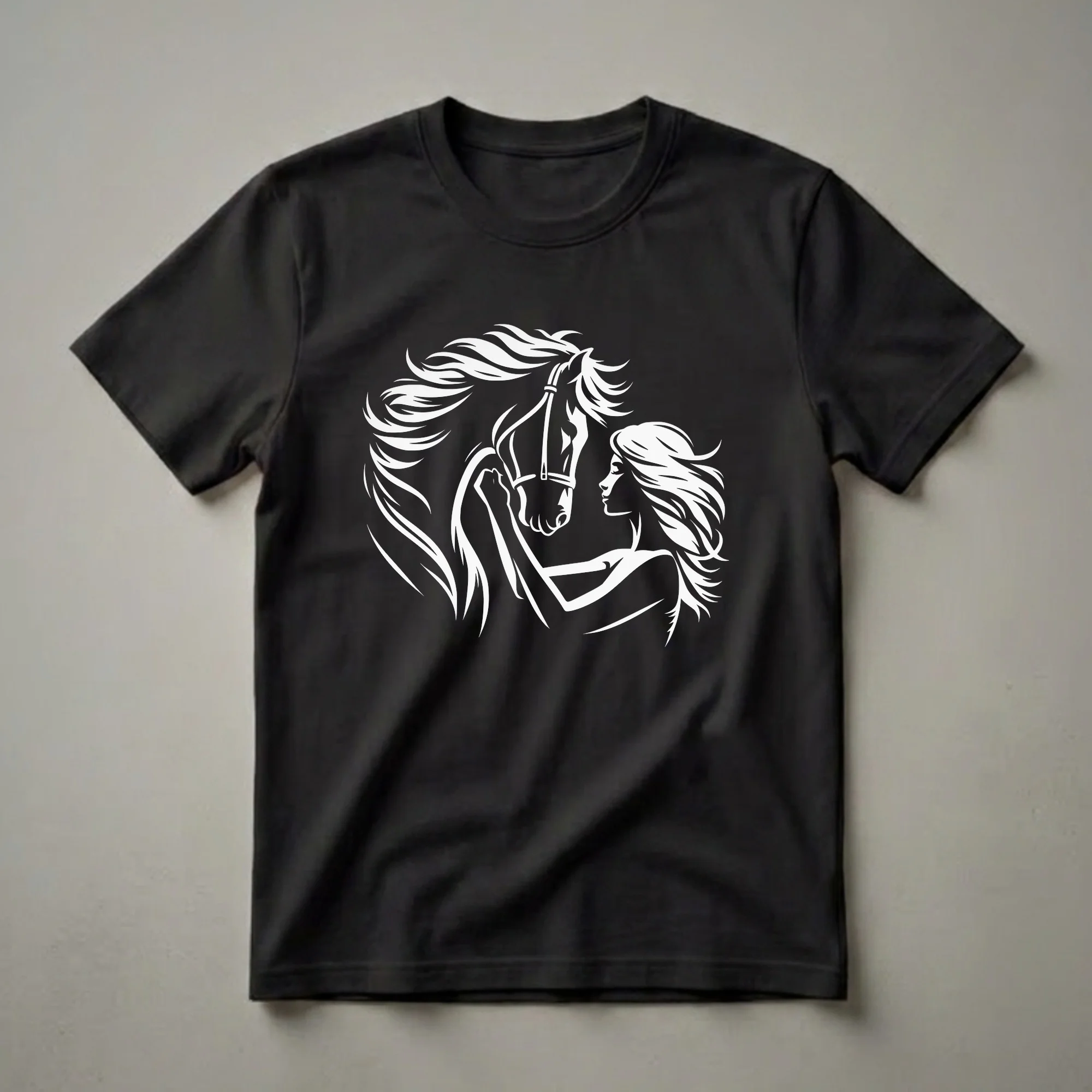 Horse lovers will reach for this eye-catching graphic tee, featuring a striking white design of a woman tenderly embracing a horse. The artwork captures the deep bond between humans and these magnificent animals, with flowing manes and wind-swept hair adding a dynamic feel. Horses, known for their strength, grace, and loyalty, have been companions to humans for thousands of years, playing vital roles in transportation, agriculture, and sport. This t-shirt is a wonderful way for any horse mom or equestrian enthusiast to express her passion. It makes a thoughtful gift for birthdays, holidays, or just because for the horse girl in your life. Wear this shirt to the stables, to a casual outing, or while watching equestrian events to showcase your connection to the equestrian world. This graphic shirt is a go-to tee for anyone who understands the unique relationship with these noble creatures.