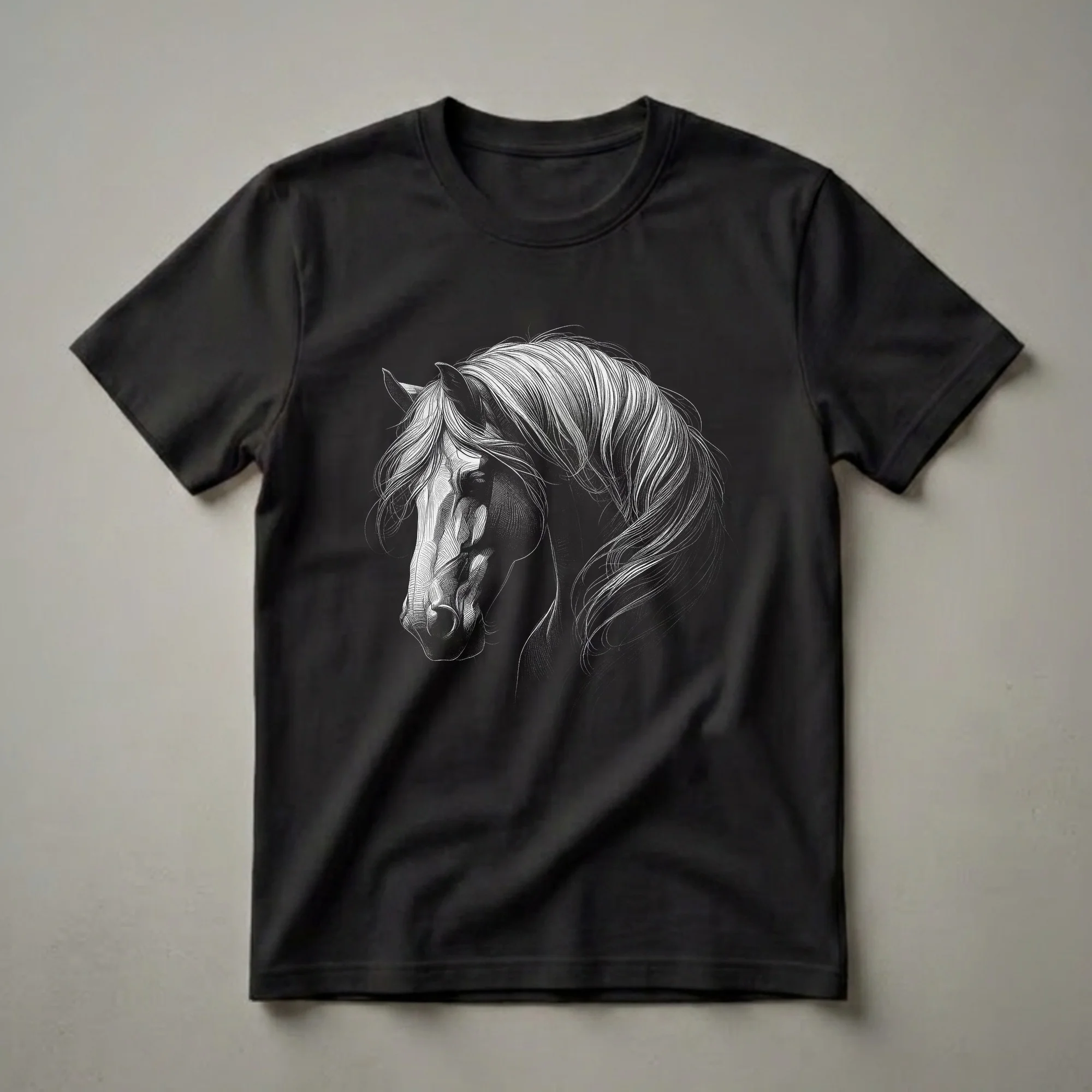 - Detailed white scratchboard-style horse head portrait with flowing mane on a black shirt.