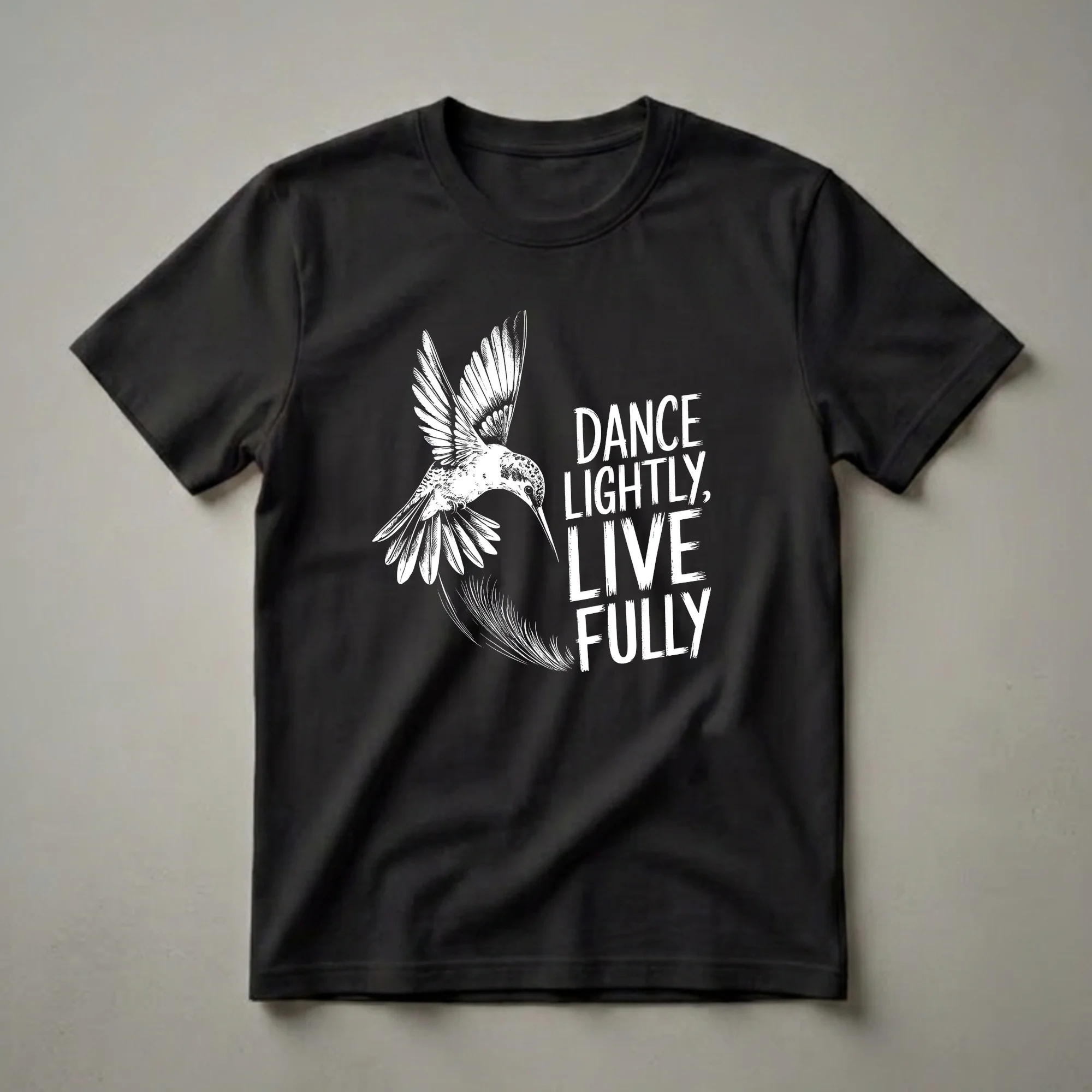 Hummingbirds, known for their incredible agility and speed, embody the spirit of living life to the fullest. This striking graphic tee captures that essence with a detailed white line-art illustration of a hummingbird in mid-flight, its wings outstretched as if dancing on air. The accompanying text, rendered in a bold, brushstroke-style font, reads "DANCE LIGHTLY, LIVE FULLY." This shirt is a perfect statement piece for women who appreciate the delicate yet powerful beauty of nature and seek to live each day with intention. Hummingbirds are the smallest birds in the class Aves, and their rapid wing beats allow them to hover and even fly backward, a testament to their extraordinary capabilities. This t-shirt works well for runners who understand the dedication and grace required to push their limits, whether on a trail or a track. It makes a thoughtful gift for the runner in your life who inspires you with their zest for life and their commitment to their sport. Wear this tee to your next race, training run, or casual outing to showcase your vibrant spirit and love for life's simple, beautiful moments.