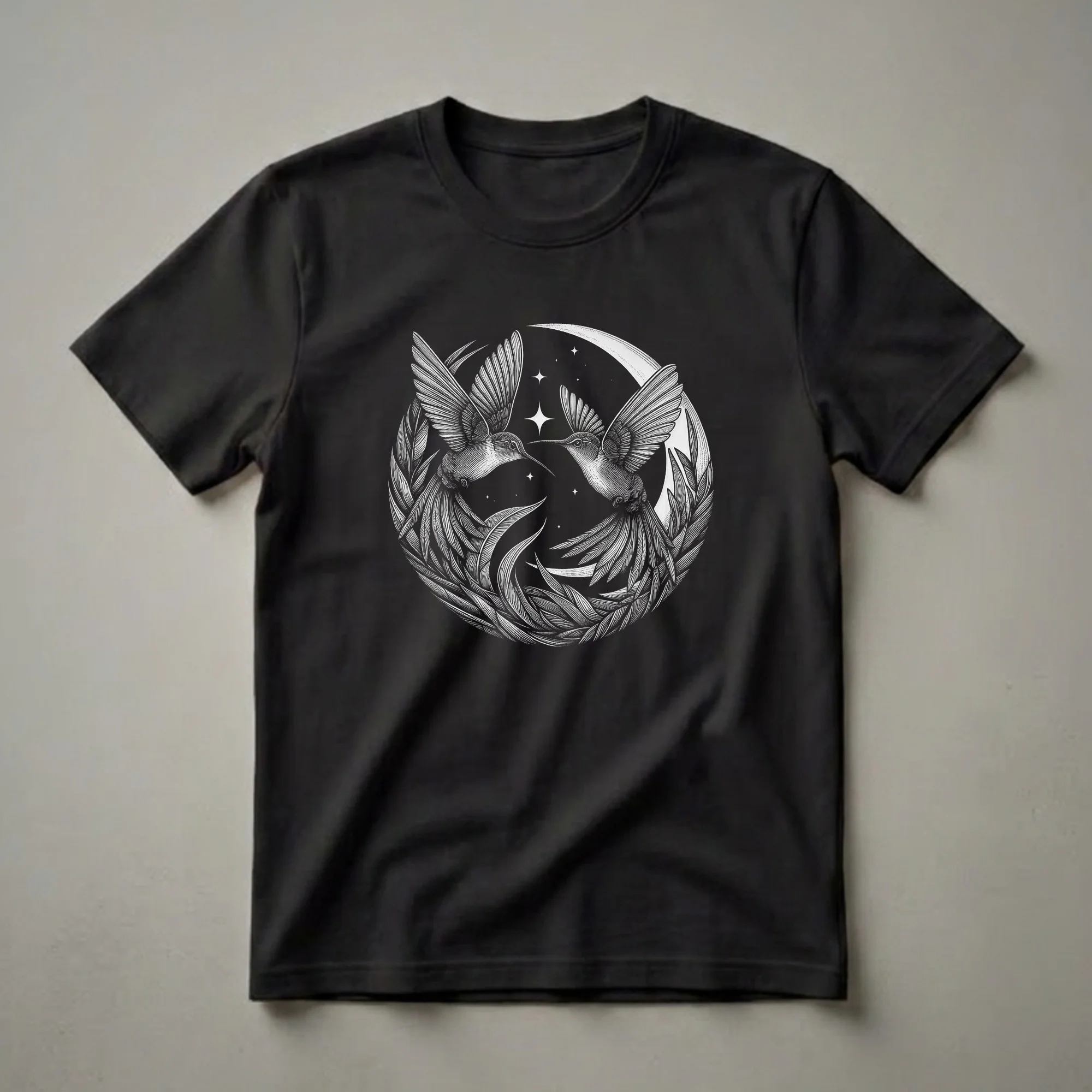 Hummingbird enthusiasts will appreciate the intricate linework and celestial theme of this unique graphic tee. The design showcases two hummingbirds in mid-flight, their delicate wings spread wide, framed by swirling foliage and a crescent moon against a starry night sky. Hummingbirds are known for their incredible agility and speed, capable of hovering and flying backward, a testament to their remarkable physiology. This t-shirt captures that sense of wonder and movement, blending the natural beauty of these tiny birds with the mystique of the cosmos. It's a staple in the collection for anyone who finds joy in observing wildlife or gazing at the night sky. This shirt works well for bird watchers, nature lovers, or anyone who appreciates detailed, artistic apparel. It makes a thoughtful gift for a friend or family member who is captivated by the natural world and its celestial wonders. Wear this tee to your next nature walk, bird-watching excursion, or casual outing to spark conversations about your passion for these fascinating creatures.