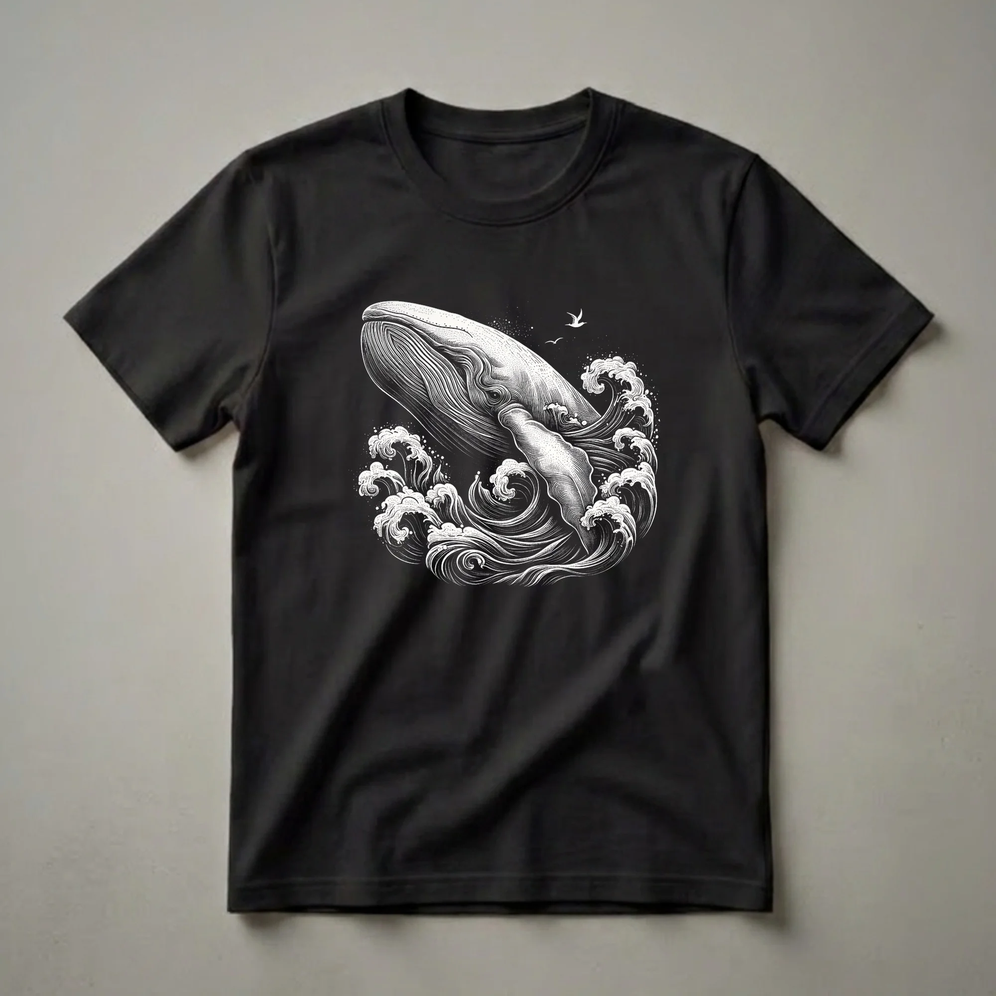 Ocean lovers who appreciate the majesty of marine life will reach for this striking graphic tee. The design features a powerful humpback whale breaching through dynamic, stylized waves, rendered in a detailed black and white illustration style reminiscent of woodcuts. Two small birds fly in the background, adding a touch of open-sea atmosphere. Humpback whales, known for their complex songs and acrobatic breaches, are found in oceans worldwide, migrating thousands of miles between feeding and breeding grounds. This shirt captures the raw energy and beauty of these magnificent creatures in their natural habitat. It's a thoughtful gift for anyone captivated by the sea, divers, or marine biology students. Wear this t-shirt to the beach, on a boat trip, or simply when you want to carry a piece of the ocean with you. This whale shirt is a staple for any marine enthusiast's wardrobe, offering both style and a connection to the underwater world.