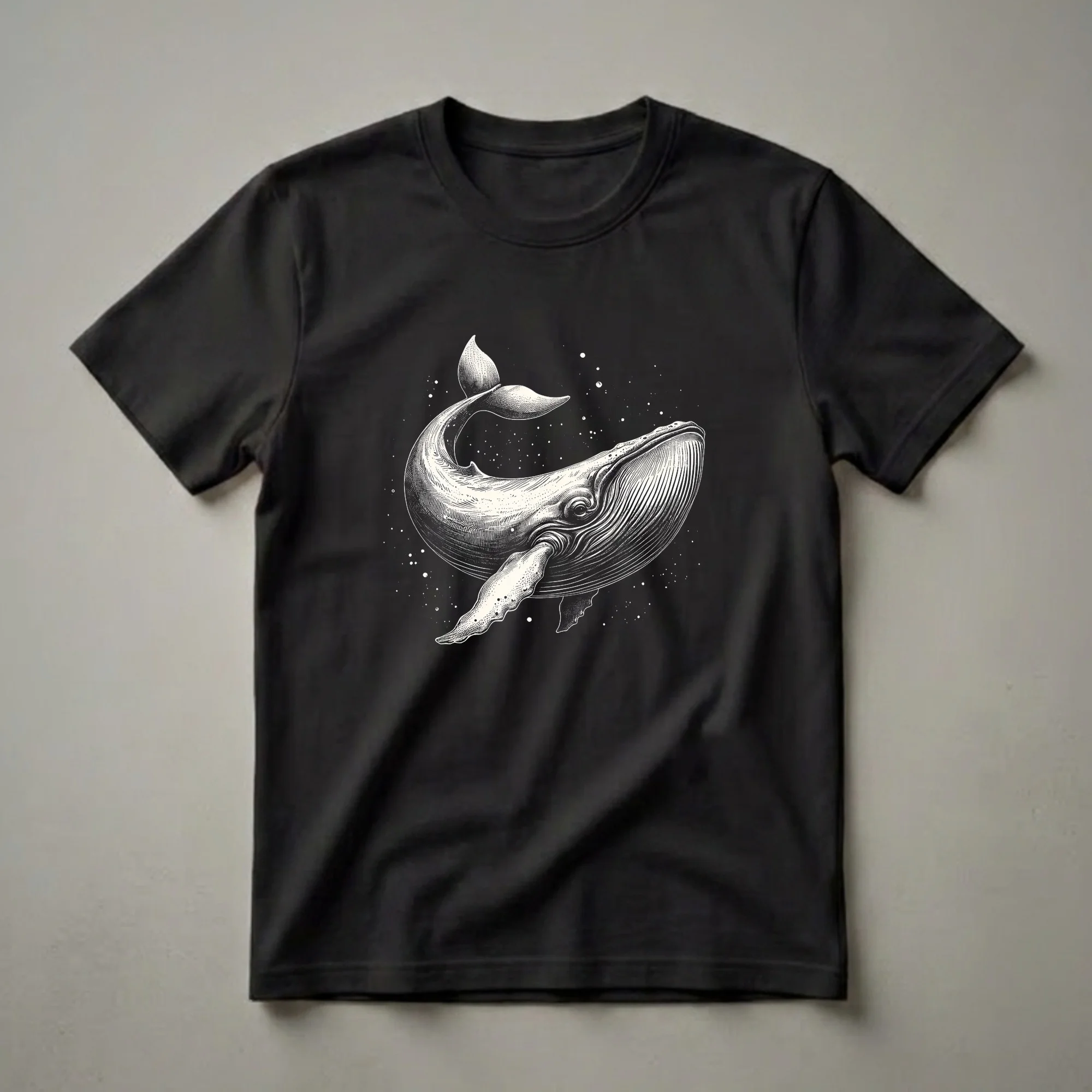 Ocean lovers and marine enthusiasts will appreciate the intricate detail of this humpback whale graphic tee. The design features a majestic humpback whale rendered in a vintage engraving style, set against a backdrop of scattered stars, evoking a sense of wonder and the vastness of the ocean. Humpback whales, known for their complex songs and acrobatic breaches, are found in oceans worldwide, migrating thousands of miles between feeding and breeding grounds. This t-shirt captures the awe-inspiring presence of these gentle giants. It's a thoughtful gift for anyone fascinated by the deep sea, marine biology, or simply the beauty of the ocean. This shirt works well for casual outings, beach trips, or as a conversation starter among fellow ocean admirers. Wear this unique piece of apparel to express your connection to the marine world and its magnificent inhabitants. The detailed linework and monochromatic palette offer a sophisticated yet striking visual that stands out.