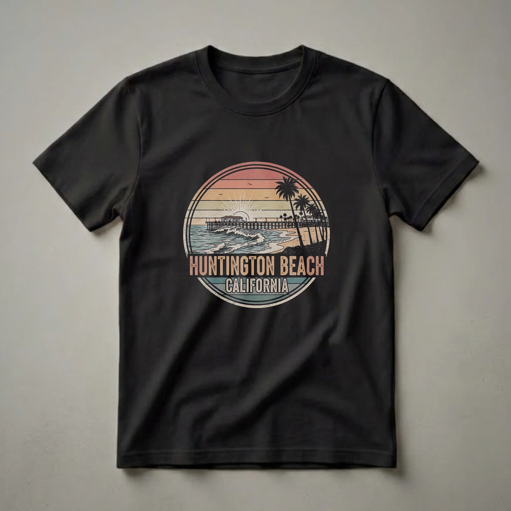 Huntington Beach has earned the Surf City USA trademark through decades of championship surfing, beginning with Duke Kahanamoku's 1914 exhibition that introduced the sport to Southern California. The city hosts the US Open of Surfing each summer, drawing over 500,000 spectators to its 1,853-foot pier. This retro graphic tee captures that Southern California beach energy with a large circular badge, the pier and ferris wheel silhouetted against layered sunset stripes in teal, coral, orange, and gold, flanked by palm trees. It is the kind of design that reads instantly as California beach culture done right. Wear this shirt at the beach, on a Pacific Coast Highway road trip through Orange County, or any casual day that deserves a shot of West Coast color. A thoughtful gift for surfers, Huntington Beach locals, and anyone who has watched the sun drop into the Pacific from the end of the pier.