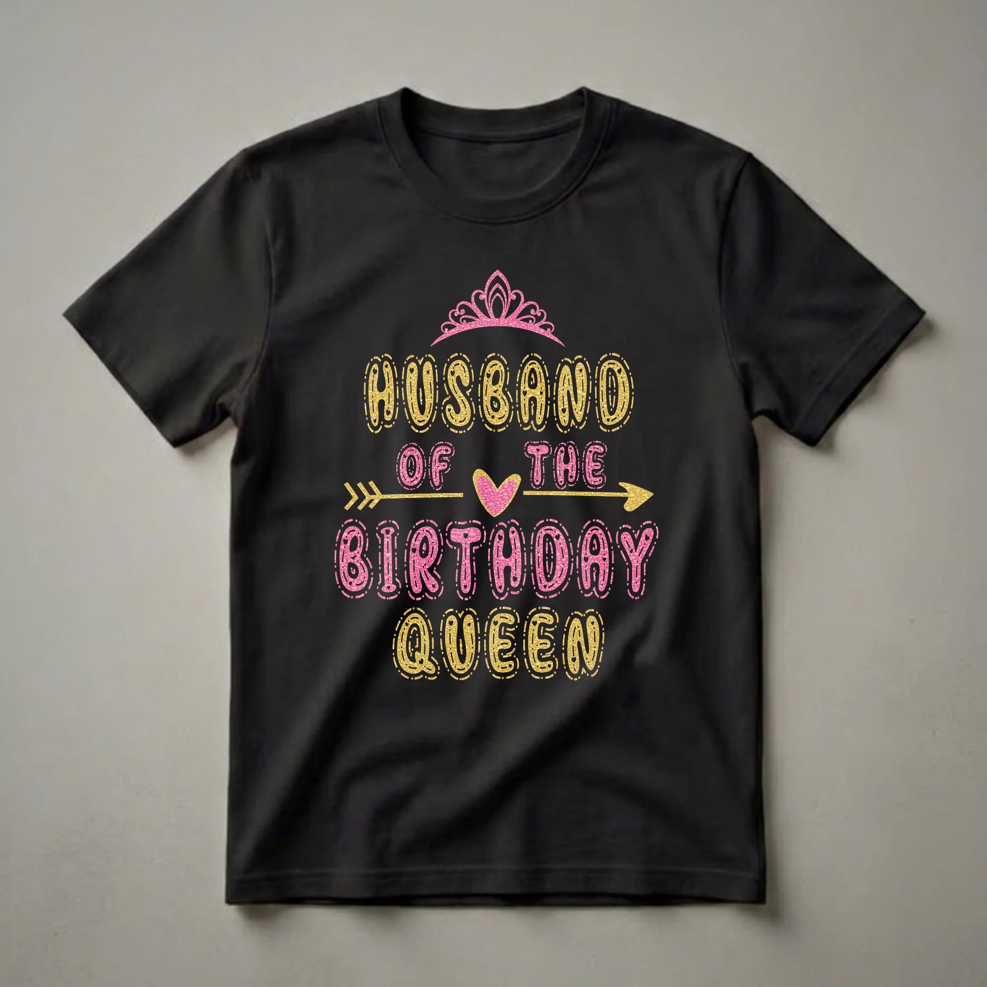 The husband of the Birthday Queen will reach for this striking graphic tee to celebrate his wife's special day. The design features a pink glittery tiara at the top, followed by the words "HUSBAND OF THE" in bold, gold glitter-effect lettering. Below this, a pink glitter heart is flanked by a golden arrow, leading to the words "BIRTHDAY QUEEN" in large, pink glitter-effect letters. The final line reads "QUEEN" in gold glitter-effect lettering. This t-shirt is a fun way for any husband to show his support and love for his partner on her milestone birthday. It's a thoughtful gift idea for wives celebrating a significant birthday, whether it's a 30th, 40th, 50th, or any other age. Imagine him wearing this shirt to her birthday dinner, party, or even a casual brunch. It's a conversation starter and a declaration of his role as the proud partner of the birthday star. This shirt is more than just apparel; it's a statement of celebration and affection, making her feel like the true queen she is on her birthday.