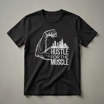 Fitness enthusiasts seeking motivation will embrace this graphic t-shirt celebrating the relentless pursuit of strength and the urban grind. The design features a bold, sketched illustration of a flexed bicep, symbolizing strength and hard work. Overlaying this is a stylized city skyline, reminiscent of Chicago's iconic architecture, suggesting the urban environment where many pursue their fitness goals. The central text, 'Hustle for the Muscle,' serves as a powerful mantra for anyone committed to building their physique. This shirt is a testament to the dedication required in weightlifting and bodybuilding. It's a go-to tee for those who understand that consistent effort in the gym leads to tangible results. Whether you're hitting the weights, attending a fitness class, or simply living an active lifestyle, this t-shirt embodies the spirit of perseverance. It makes a thoughtful gift for the fitness enthusiast in your life who is always striving for more gains. Wear this shirt to the gym to inspire yourself and others, or sport it casually to showcase your commitment to a healthy and strong lifestyle. The graphic design is printed on a comfortable tee, making it suitable for both intense workouts and everyday wear.