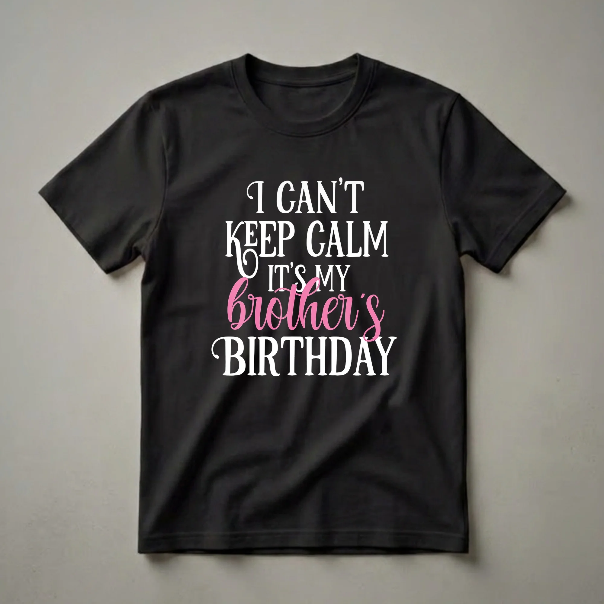 Sisters who are excited for their brother's birthday will reach for this eye-catching graphic tee. The design features bold white lettering that reads "I CAN'T KEEP CALM" above "IT'S MY" and then "BIRTHDAY" in large white capital letters. The word "brother's" is prominently displayed in a vibrant pink script font, adding a playful touch. This shirt is a fantastic way for a sister to express her enthusiasm for her brother's special day. Whether it's a milestone birthday or just another year, this tee announces the celebration with flair. It's a thoughtful gift idea for any sister who wants to join in the birthday festivities and make it known that the party is for her brother. Wear this t-shirt to the birthday party, family gathering, or any event celebrating your brother. It's a staple in the collection for any sibling who loves to celebrate family milestones. This shirt is a fun addition to any birthday outfit, making it clear who the guest of honor's sibling is and how excited they are for the occasion.