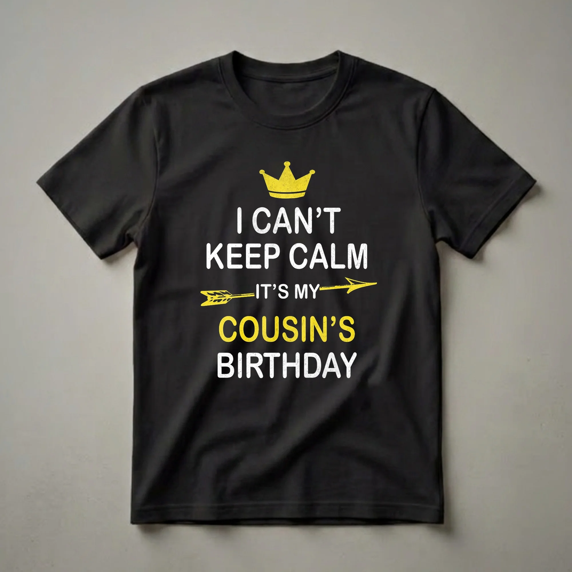 Let everyone know you're ready to celebrate the most important person in your family with this fun Cousin's Birthday Party graphic tee. This graphic tee is for anyone who wants to proudly announce that it's their cousin's special day. The design features bold white text that reads "I CAN'T KEEP CALM" above "IT'S MY COUSIN'S BIRTHDAY". A bright yellow crown sits atop the phrase, symbolizing royalty and celebration, while a matching yellow arrow pierces through the center, adding a playful, dynamic element. This shirt is a fantastic way for a sibling or cousin to show their excitement and support for the birthday person. It's a thoughtful gift idea for any family member who cherishes their cousins and enjoys celebrating together. Wear this tee to the birthday party, family reunion, or any casual gathering where you want to share in the festive spirit. It's a comfortable and eye-catching piece of apparel that sparks conversation and camaraderie among family members. This t-shirt is a staple for anyone looking to add a touch of fun to birthday celebrations.