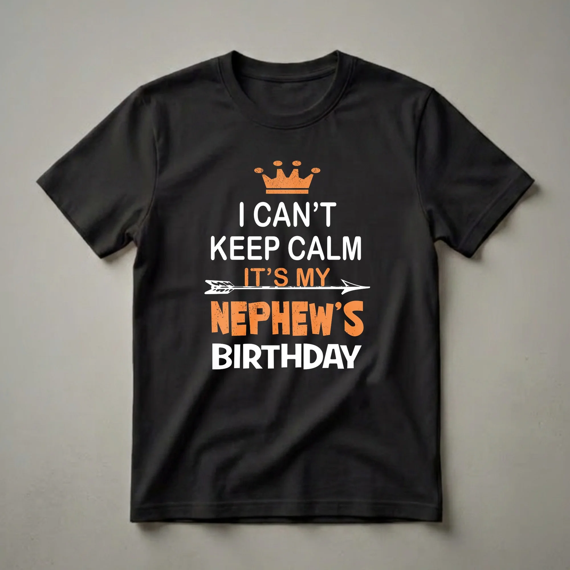 Aunties and uncles who are excited for their nephew's special day will reach for this graphic tee. The design features bold, distressed orange and white lettering on a black background. At the top, a distressed orange crown sits above the phrase "I CAN'T KEEP CALM". An arrow graphic pierces through the center, separating "IT'S MY" from the prominent "NEPHEW'S BIRTHDAY" text below. This shirt is a fun way to express your enthusiasm for your nephew's birthday celebration. It makes a thoughtful gift for any aunt or uncle who loves to spoil their nephew and join in on the festivities. Wear this t-shirt to the birthday party, family gathering, or any casual outing leading up to the big day. It's a staple in the collection for any proud aunt or uncle ready to celebrate their favorite young man's milestone. This tee is a conversation starter and a clear declaration of your excitement for the occasion.