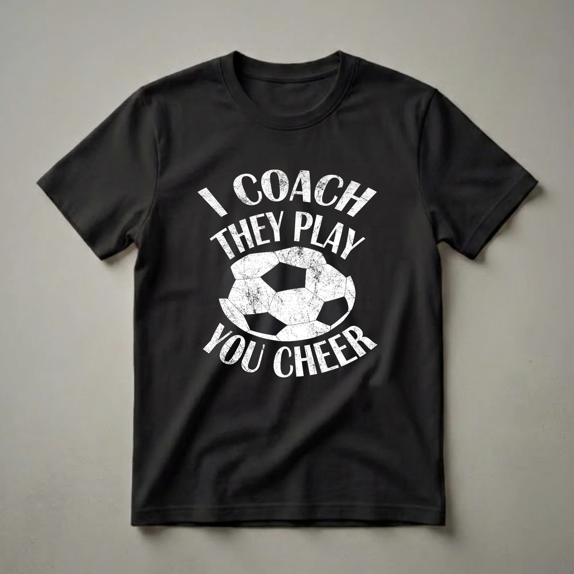 Soccer coaches who pour their energy into training young athletes will appreciate this graphic tee. The design features bold, distressed white lettering that reads "I COACH THEY PLAY YOU CHEER" encircling a classic black and white soccer ball. This shirt is a clear declaration of a coach's role and the support system around the team. Soccer, known globally as football, demands dedication from coaches who guide players through drills, strategy, and sportsmanship. This apparel is for the coach who lives and breathes the game, from early morning practices to weekend matches. It makes a thoughtful gift for any soccer coach, whether they are leading a youth league team, a high school squad, or a college program. Imagine wearing this t-shirt to the sidelines, a team dinner, or even on casual days, proudly representing your commitment to the sport and your players. It’s a staple in the collection for any coach who understands the balance of instruction and encouragement needed to foster a winning spirit and develop young talent on the field.