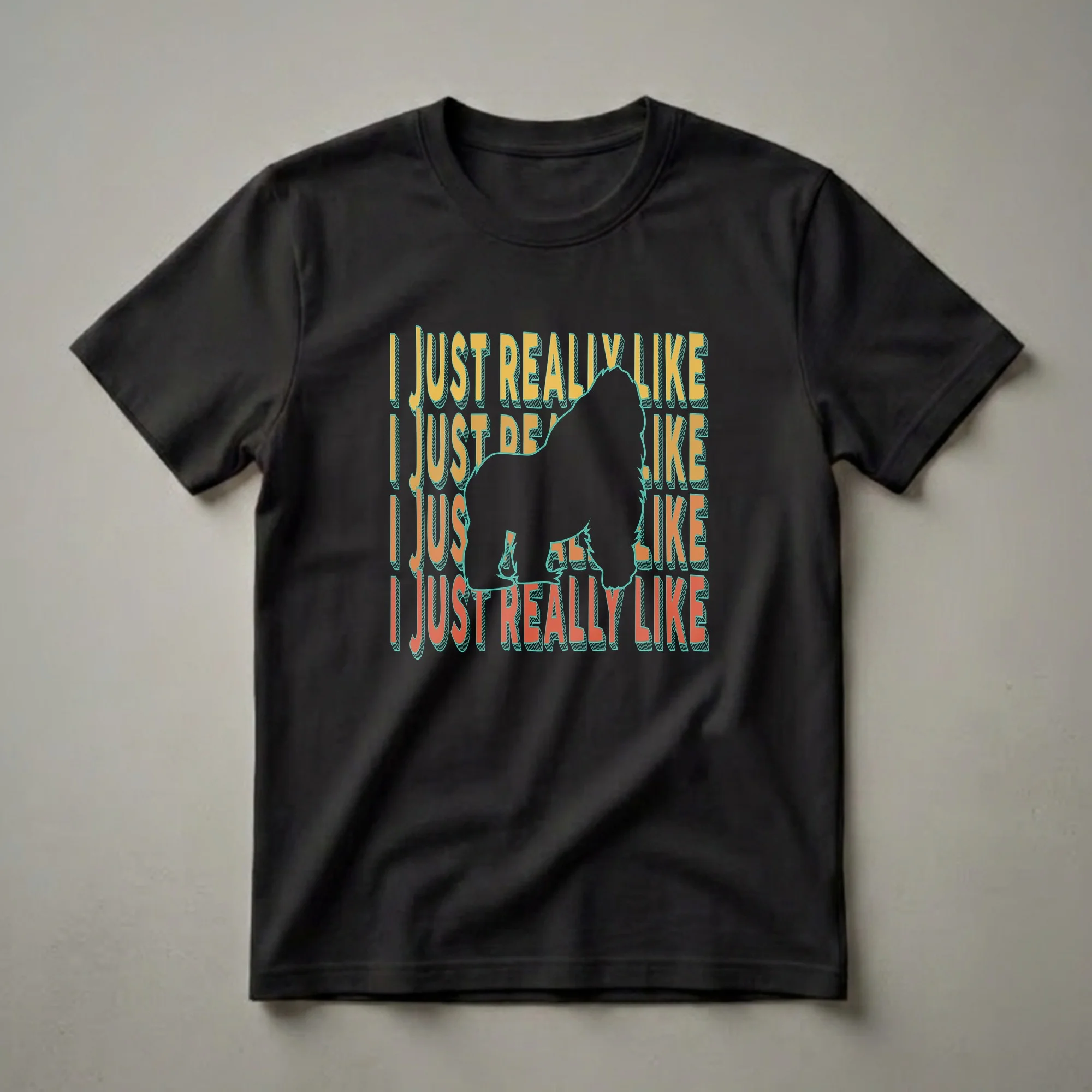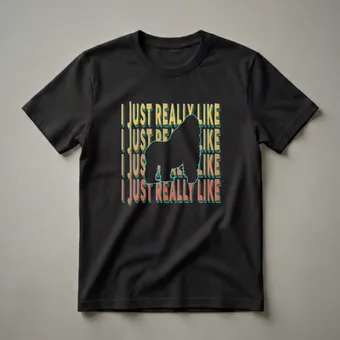 Gorilla enthusiasts who appreciate a good laugh will reach for this eye-catching graphic tee. The design features a bold black silhouette of a gorilla, a majestic primate known for its intelligence and strength, set against a repeating pattern of the phrase "I Just Really Like" in a retro font. The text alternates between a vibrant orange and a sunny yellow, both outlined in a striking teal, creating a visually dynamic effect. Gorillas, native to the forests of central sub-Saharan Africa, are fascinating creatures whose social structures and behaviors have long captivated scientists and the public alike. This shirt is a thoughtful gift for anyone who admires these incredible animals, whether they are a primatologist, a zoo keeper, or simply someone who finds gorillas endlessly interesting. It's a great conversation starter for casual outings, game nights, or just lounging around. Wear this t-shirt to express your unique sense of humor and your passion for the animal kingdom. This tee is a staple in the collection for anyone who loves a good animal pun and a touch of vintage flair.