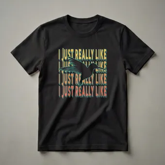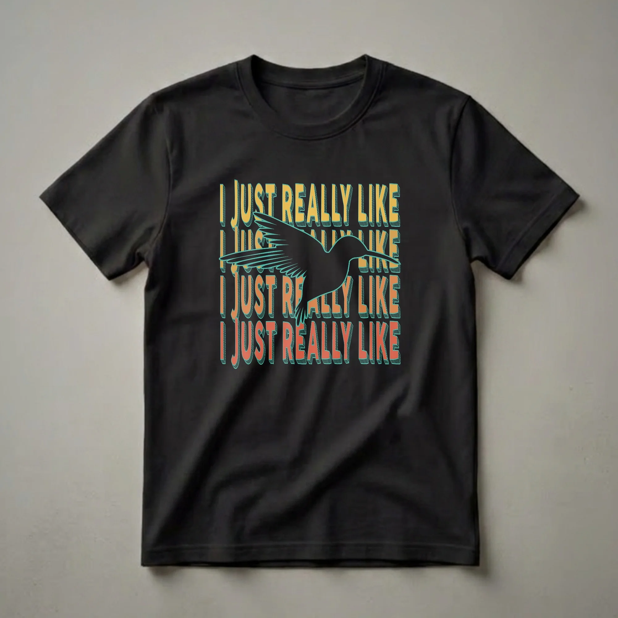 Hummingbird enthusiasts will reach for this eye-catching graphic tee, featuring a striking silhouette of the tiny bird in mid-flight. The repeating text, 'I JUST REALLY LIKE', is rendered in a bold, retro font with a 3D effect, creating a visually engaging design. Hummingbirds are known for their incredible agility and ability to hover, a feat achieved by rapidly beating their wings, often up to 50 times per second. This shirt is a thoughtful gift for anyone who finds joy in observing these fascinating creatures in their natural habitat, whether in their backyard feeders or during migration. It's a conversation starter for bird watchers, nature lovers, or anyone who simply appreciates the whimsical charm of these energetic avians. Wear this t-shirt to casual outings, birdwatching expeditions, or simply while relaxing at home, showcasing your passion for these miniature marvels of nature. This unique shirt celebrates the simple, yet profound, admiration for hummingbirds.