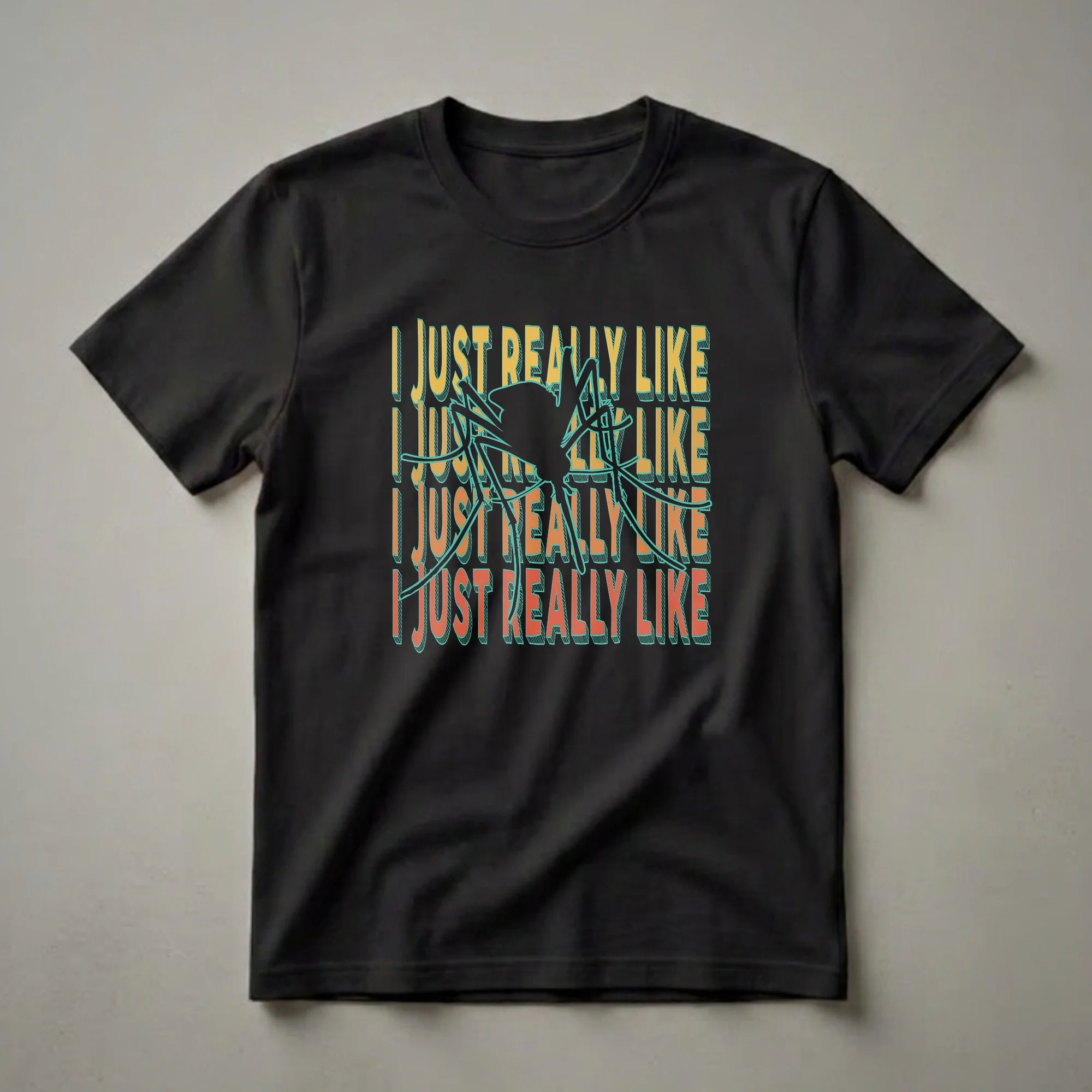 Mosquitoes, those ubiquitous flying insects, are often associated with summer evenings and the occasional itchy bite. This graphic tee embraces a humorous take on these creatures, featuring a bold silhouette of a mosquito front and center. The phrase 'I JUST REALLY LIKE' is repeated in a retro, distressed font, creating a striking visual that plays on unexpected affection for the insect. This shirt is a conversation starter, a thoughtful choice for those who find humor in the unconventional and enjoy a good laugh. It's a thoughtful gift for entomology students, bug enthusiasts, or anyone with a peculiar fondness for the buzzing pests. Wear this tee to casual gatherings, game nights, or outdoor barbecues where a touch of quirky humor is always welcome. The design's retro aesthetic adds a nostalgic flair, making it a standout piece for your wardrobe. This t-shirt is a fun way to express a unique personality and a love for all things slightly odd.