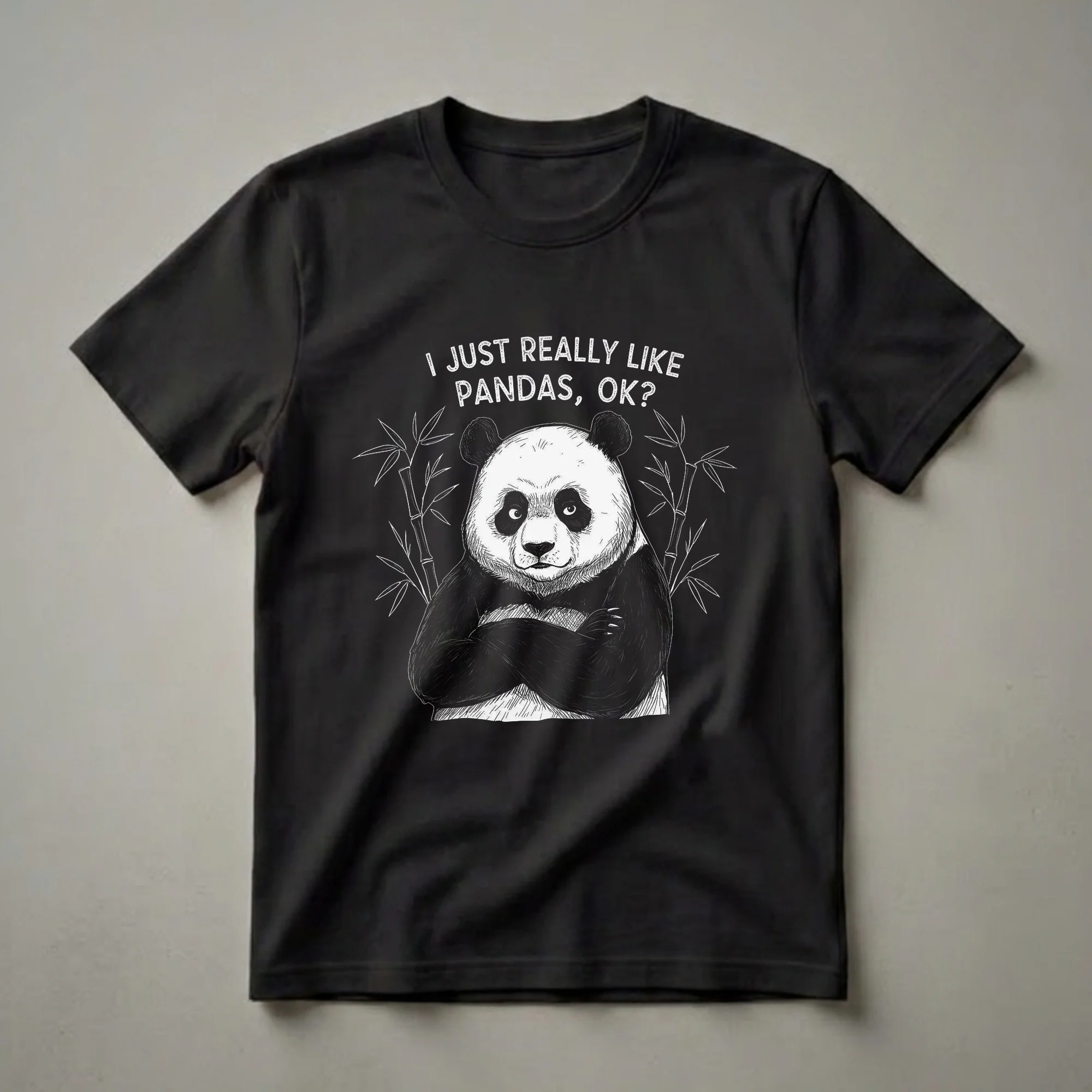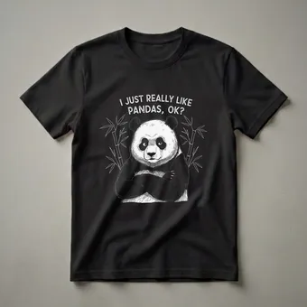 Panda enthusiasts who appreciate a touch of humor will reach for this eye-catching graphic tee. The design features a hand-drawn illustration of a giant panda with its arms crossed, exuding a confident, slightly sassy demeanor. Above the panda, the text reads, "I JUST REALLY LIKE PANDAS, OK?" in a distressed, white font. Flanking the panda are stylized bamboo stalks, a nod to their primary food source. Giant pandas, native to China, are known for their distinctive black and white markings and their diet consisting almost exclusively of bamboo. This t-shirt is a fun way for anyone to express their adoration for these beloved bears. It makes a thoughtful gift for friends or family members who can't get enough of pandas, whether they're celebrating a birthday or just want to add a playful piece to their wardrobe. Wear this shirt to casual outings, game nights, or just lounging around the house to showcase your unique sense of humor and your passion for pandas.