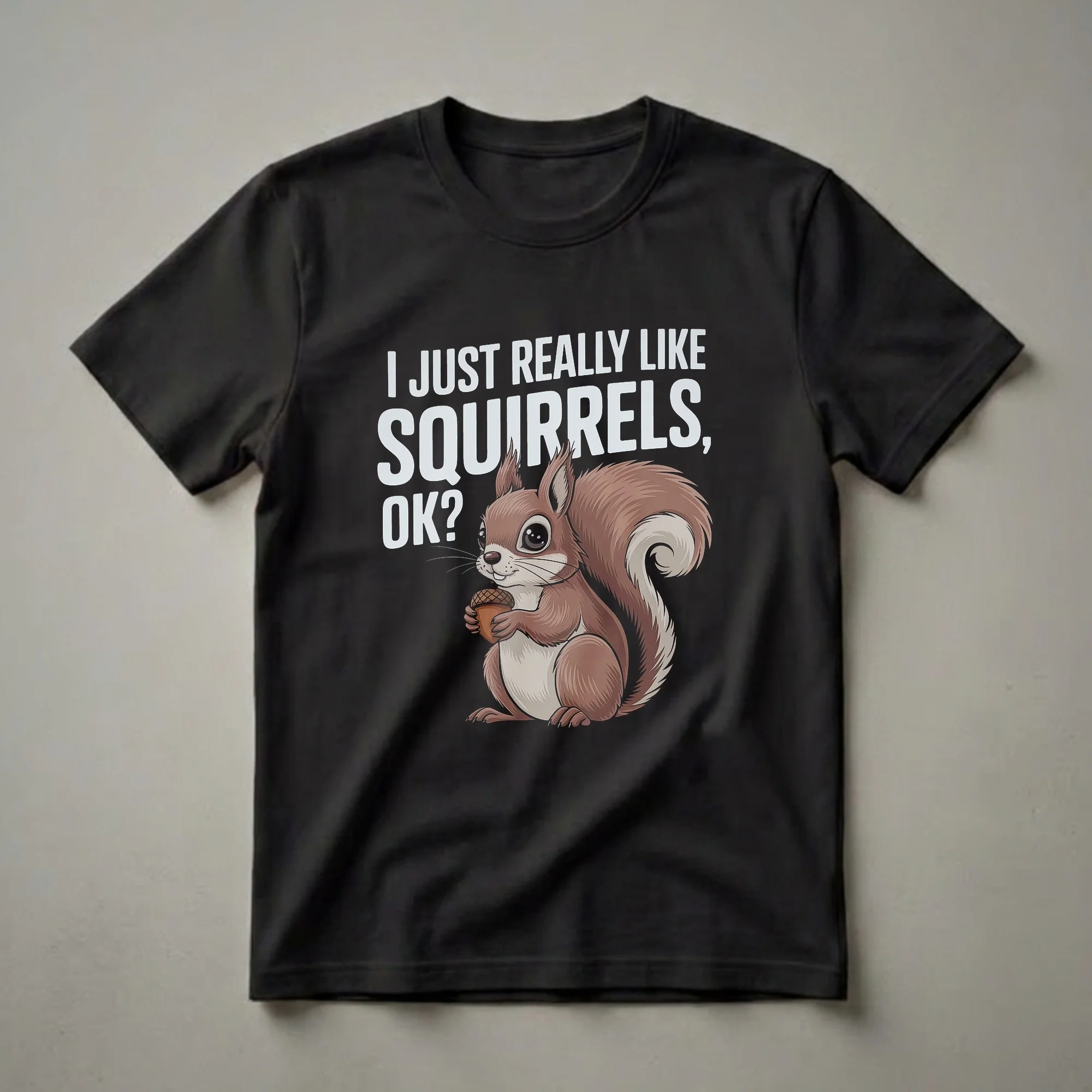 Squirrel enthusiasts who want to wear their passion on their sleeve will reach for this eye-catching graphic tee. The design features a charming, cartoon-style squirrel with large, expressive eyes, clutching a single acorn. Above the adorable rodent, bold white lettering declares, "I JUST REALLY LIKE SQUIRRELS, OK?". This playful statement captures the essence of anyone who finds joy in observing these energetic creatures scampering through parks and trees. Squirrels, known for their agility and their role in seed dispersal, are a common sight in many urban and natural environments, often bringing a smile to onlookers' faces. This t-shirt is a thoughtful gift for the squirrel lover in your life, whether it's for a birthday, a holiday, or just because. It's a fun conversation starter and a comfortable staple for casual wear, game nights, or weekend brunches. Let this tee be your declaration of affection for these fascinating woodland mammals. This shirt is a go-to for anyone who appreciates a good chuckle and a cute animal.