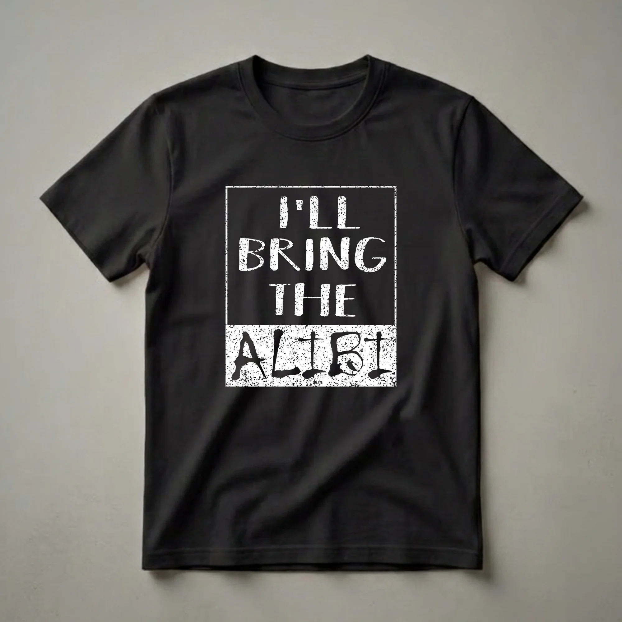 - Funny 'I'll Bring The Alibi' graphic tee for bachelor parties.