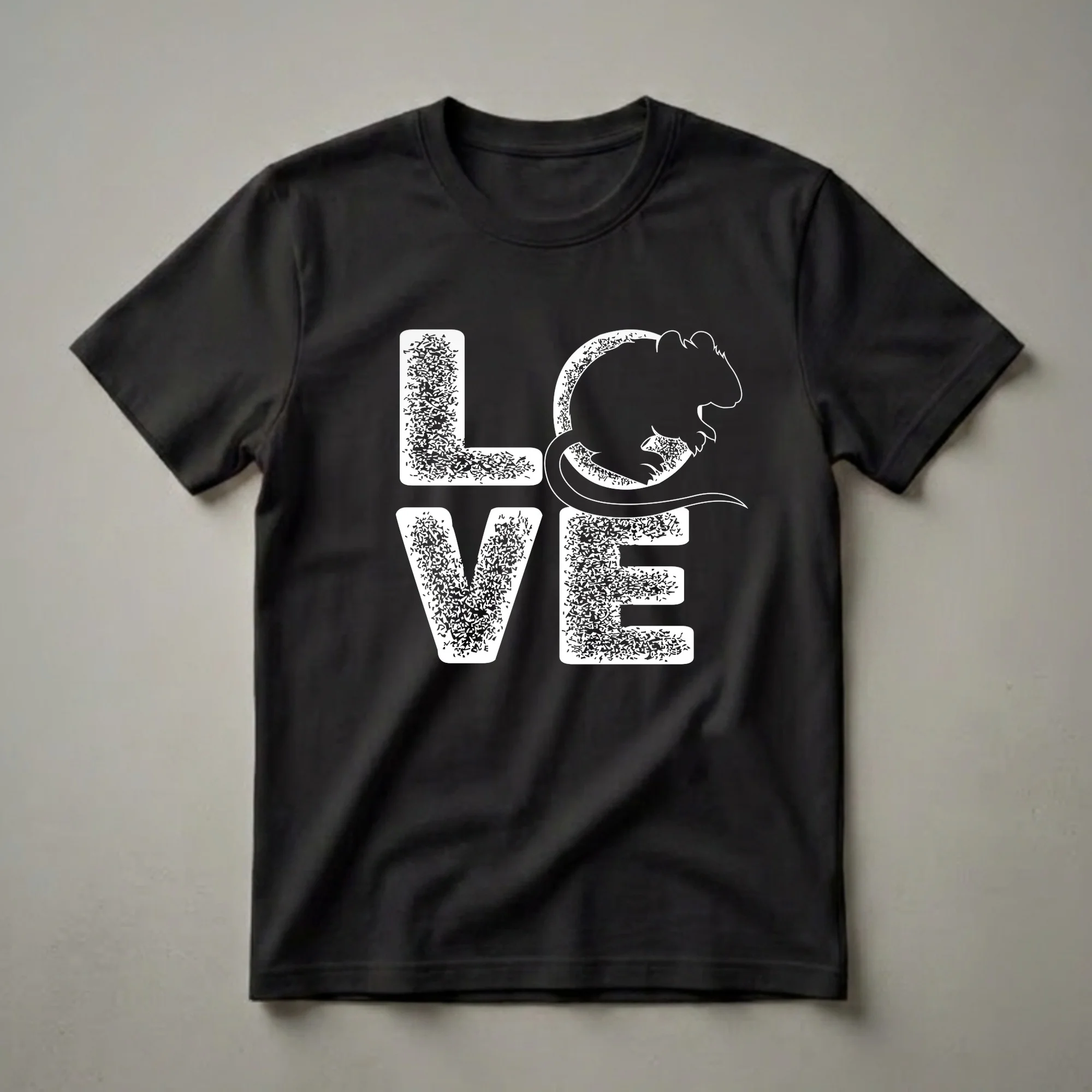 Gerbil owners who adore their small, energetic pets will appreciate this unique graphic tee. The design features the word 'LOVE' in a distressed white font, with the letter 'O' creatively replaced by the silhouette of a gerbil. Gerbils, known for their burrowing habits and active nature, are popular small pets that bring joy to many households. These rodents are native to arid regions of Africa and Asia, where they are adapted to survive in harsh environments. This shirt is a thoughtful gift for anyone who finds delight in caring for these fascinating creatures. It's a staple in the collection for a gerbil mom or dad to express their affection for their pet. Wear this comfortable t-shirt to your next pet expo, a casual outing with friends, or simply while relaxing at home with your beloved gerbil. This apparel is a wonderful way to showcase your passion for these delightful little animals.