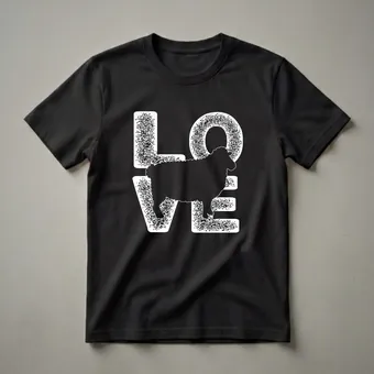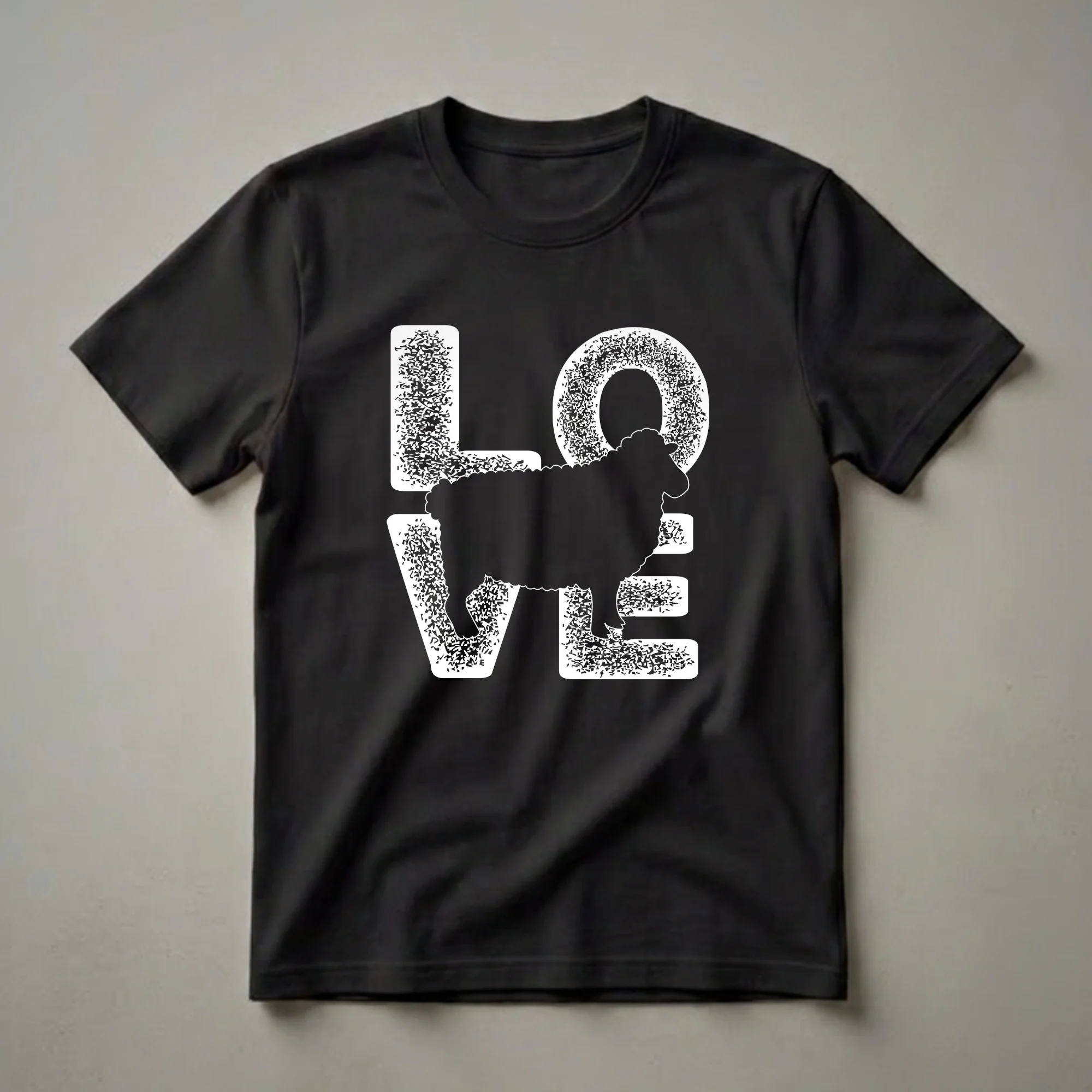 Farm animal lovers who adore the gentle nature of sheep will reach for this unique graphic tee. The design features the word 'LOVE' in bold, distressed white lettering, with a striking black silhouette of a sheep replacing the letter 'O'. This eye-catching t-shirt is a clear declaration of affection for these woolly farm dwellers. Sheep, known for their docile temperament and their vital role in agriculture for wool and meat production, have been domesticated for thousands of years. They are social animals, often found grazing in flocks across pastures and rolling hills. This shirt is a thoughtful gift for anyone who has a special connection to sheep, whether they own a farm, work with animals, or simply admire them from afar. It's a comfortable and stylish way to express your passion for these beloved farm animals. Wear this tee to your local farmer's market, a country fair, or simply while relaxing at home, letting your love for sheep shine.