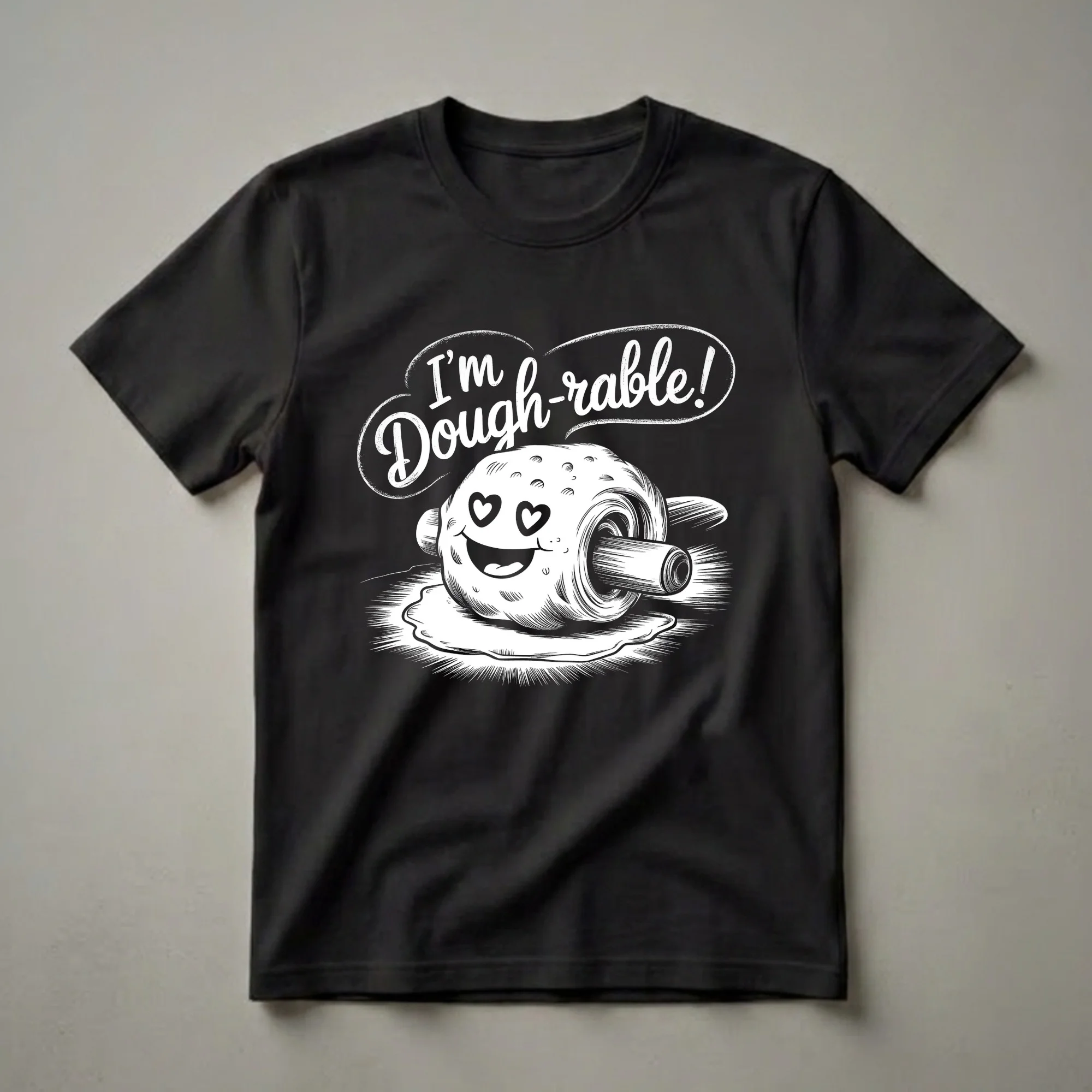 Bakers and pastry enthusiasts will reach for this playful graphic tee that features a charming rolling pin character. The design showcases a rolling pin with a cheerful face, complete with heart-shaped eyes, resting in a puddle of dough. Above the character, the text "I'm Dough-rable!" is written in a whimsical, hand-drawn style, playing on the word 'adorable' and the essential baking ingredient. This shirt is a thoughtful gift for anyone who finds joy in the kitchen, whether they are professional bakers or home cooks who love to experiment with dough. It's a fun way to express a passion for baking and a sense of humor. Wear this t-shirt while kneading dough, decorating cakes, or enjoying a casual brunch with fellow food lovers. The unique design makes it a conversation starter and a staple in any baker's casual wardrobe. This eye-catching shirt celebrates the art of baking with a delightful pun.